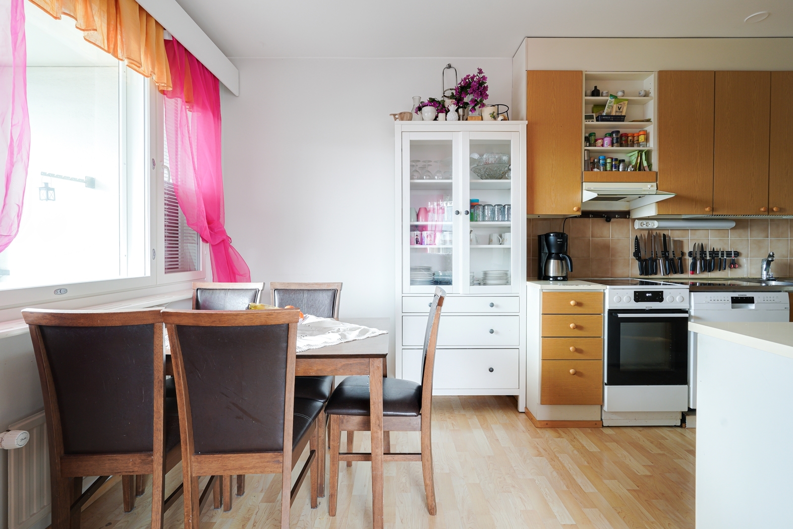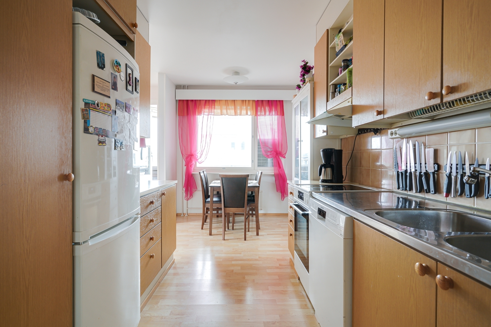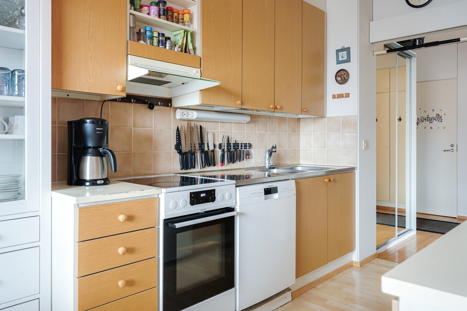 Liesi (Keraaminen liesi), seinät (maali), lattiat (laminaatti), liesituuletin, jääkaappipakastin, astianpesukone ja kiinteät valaisimet |