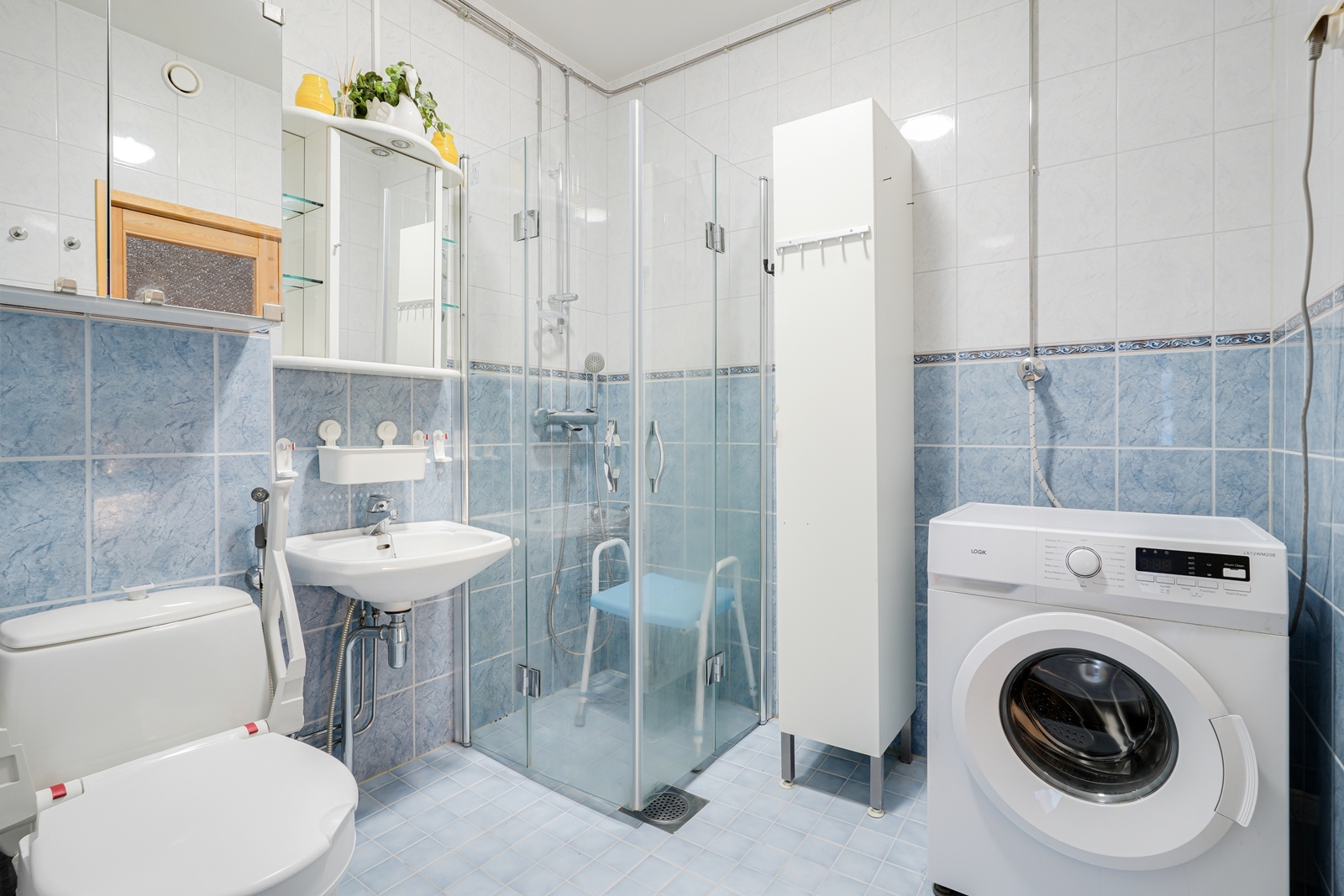 Peilikaappi, lattialämmitys, suihkuseinä, wc-istuin, pesukoneliitäntä, allaskaappi, suihku ja kiinteät valaisimet, seinät (kaakeli), lattiat (laatta) |