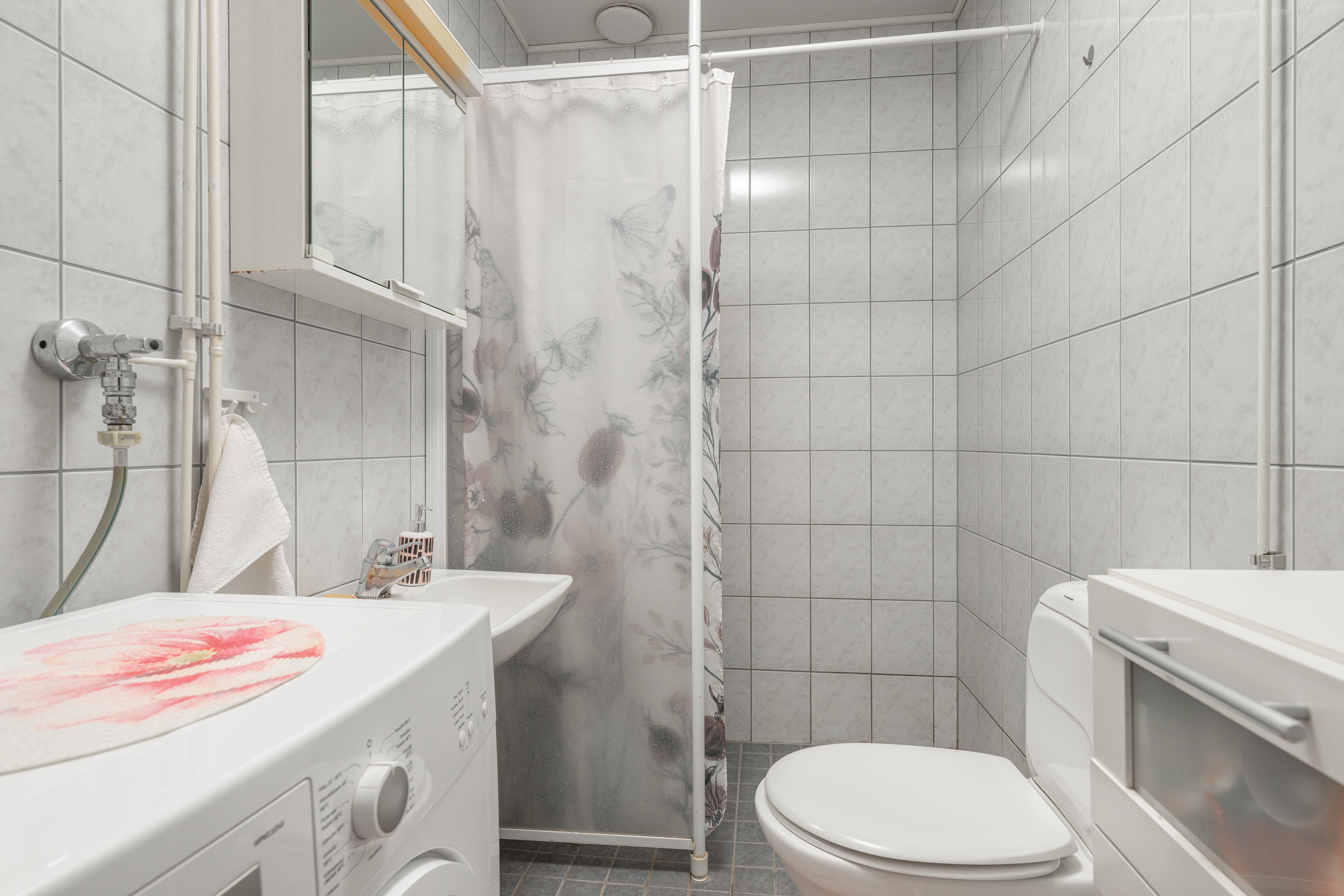 | Kylpyhuoneen kuvaus | WC-istuin, suihku, pesukoneliitäntä, suihkuseinä, peilikaappi ja pesuallas, seinät (kaakeli), lattiat (laatta) |