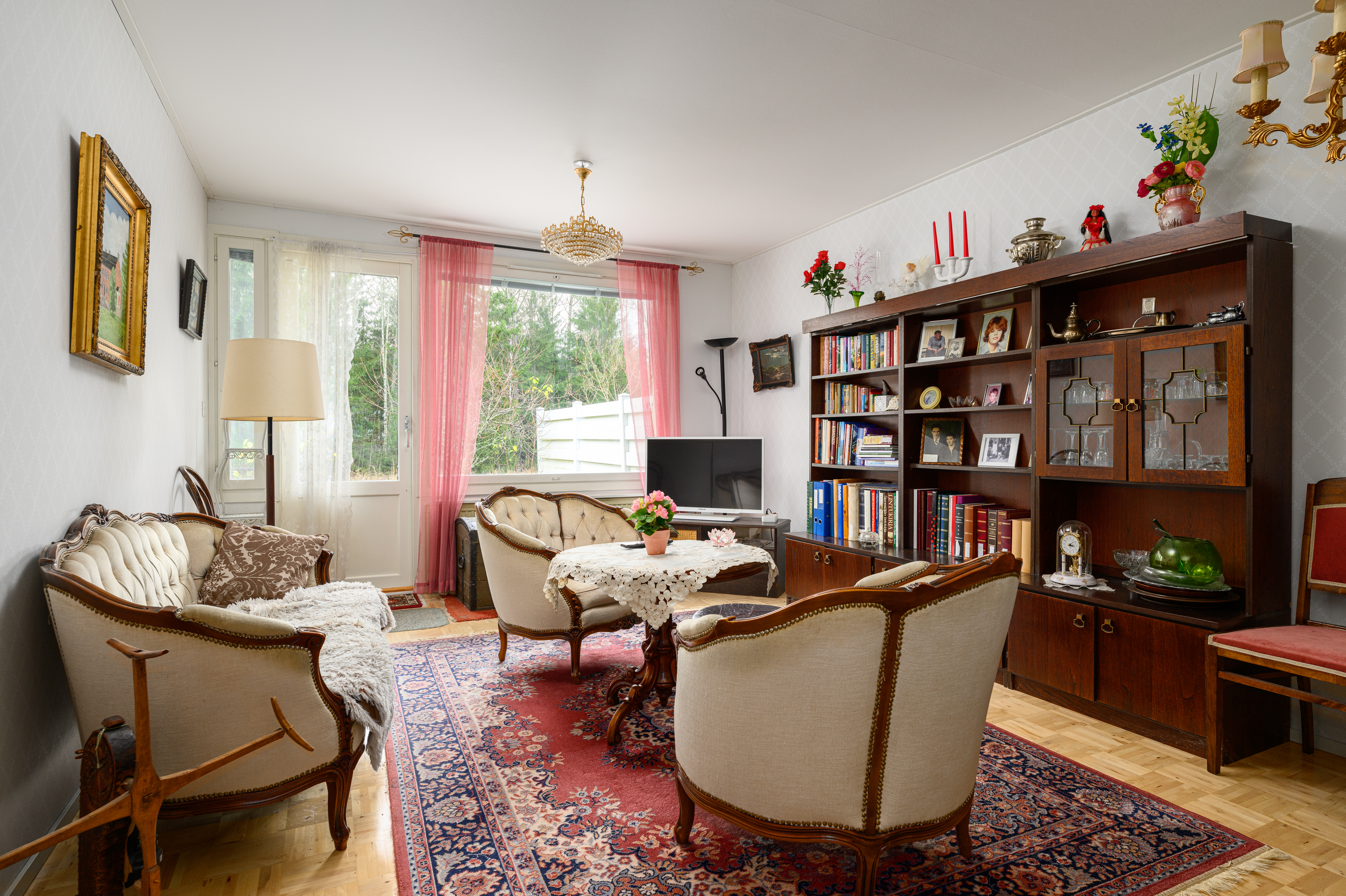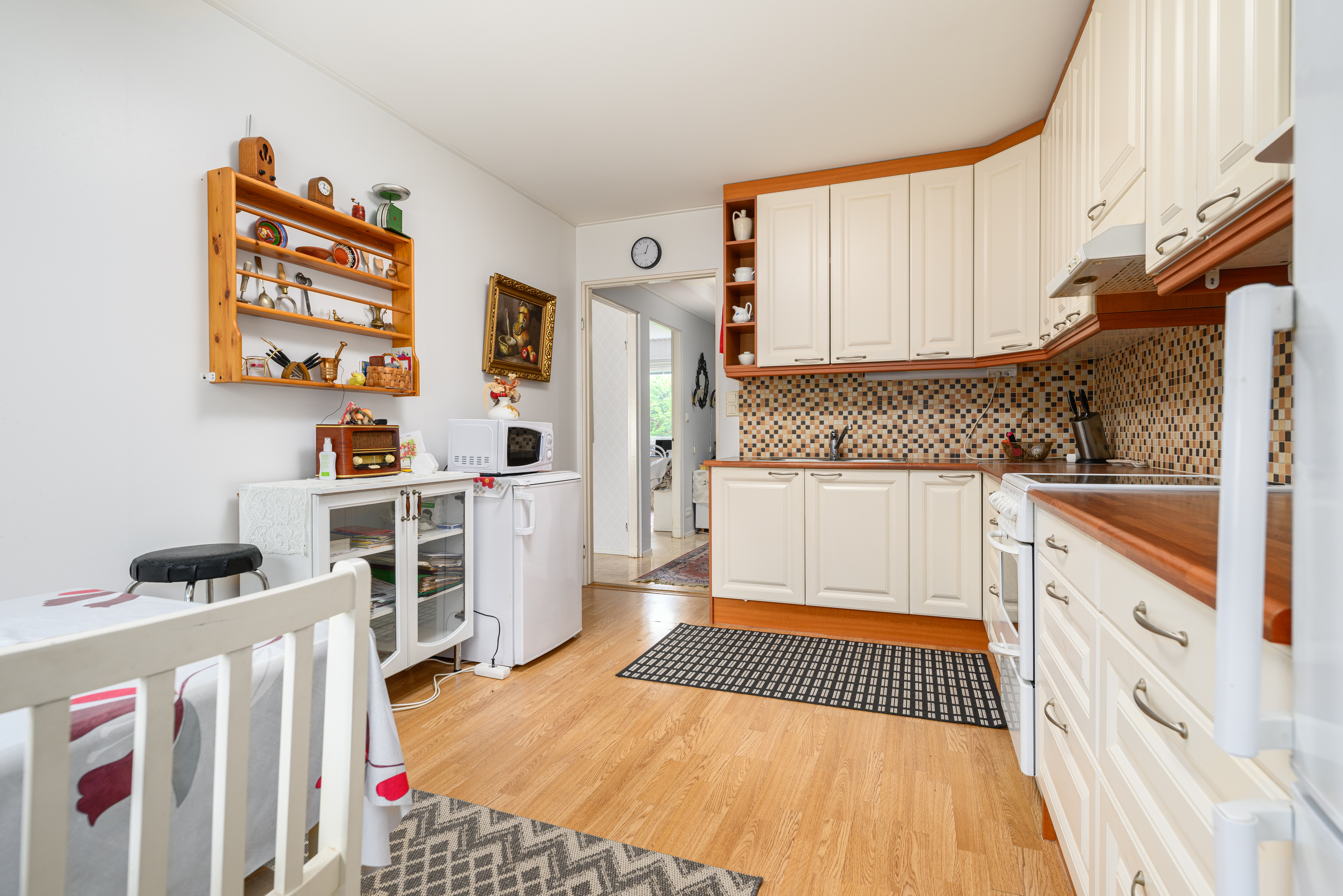 Vuonna 1975 valmistunut koti on pidetty hyvässä kunnossa ja sen tilat ovat käytännölliset. Asunnon lämmitysjärjestelmä on päivitetty maalämpöön, mikä tuo energiatehokkuutta ja säästöjä. Olohuoneen ja makuuhuoneen lattiat ovat kaunista parkettia, ja keittiöstä löytyy kaikki tarvittava arjen sujuvuuteen, kuten jääkaappipakastin ja astianpesukone. Kylpyhuoneessa on mukavuutta lisäävä lattialämmitys, ja oma sauna tarjoaa rentouttavat löylyt.