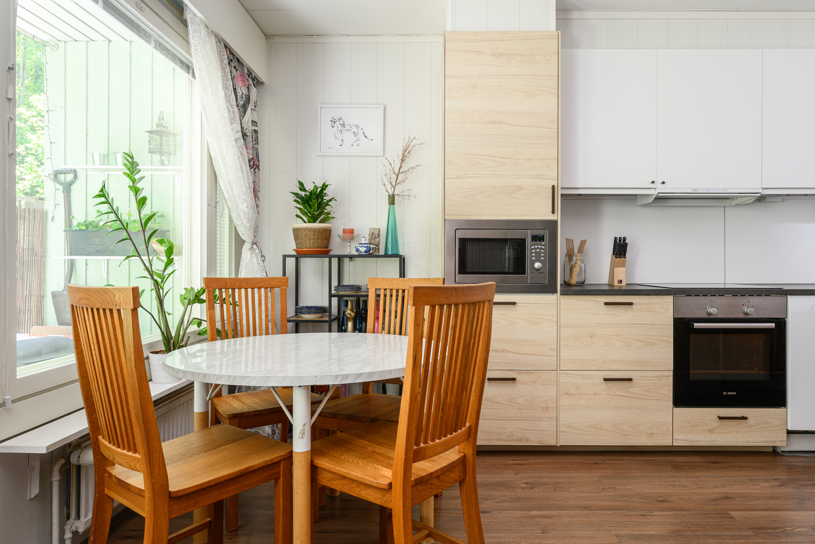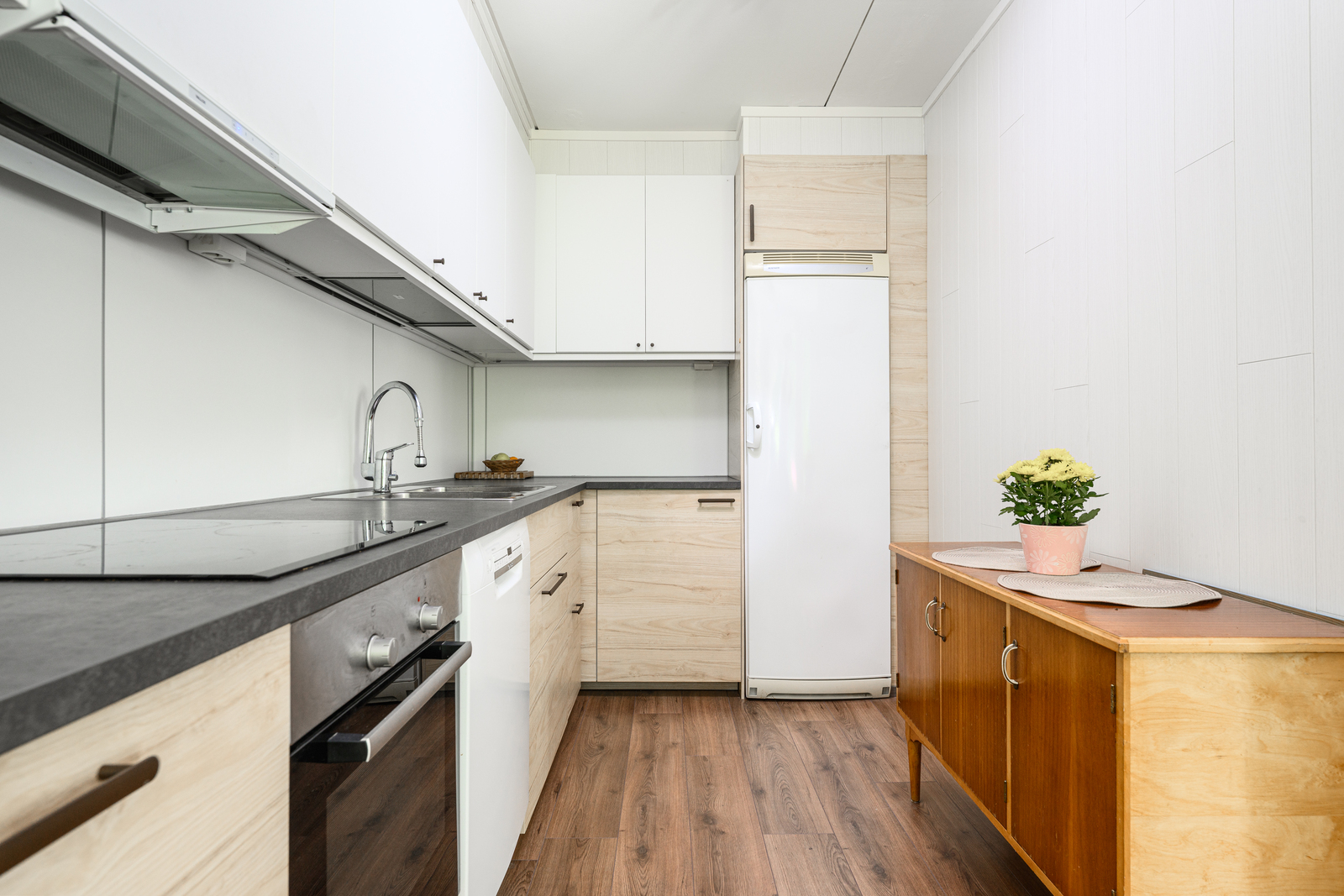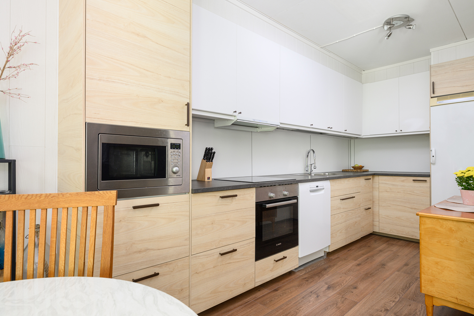 Liesi (integroitu), työtasot (laminaatti), seinät (maali), lattiat (laminaatti), astianpesukone, liesituuletin, mikroaaltouuni ja jääkaappipakastin, Keittiö remontoitu vuonna 2022 |