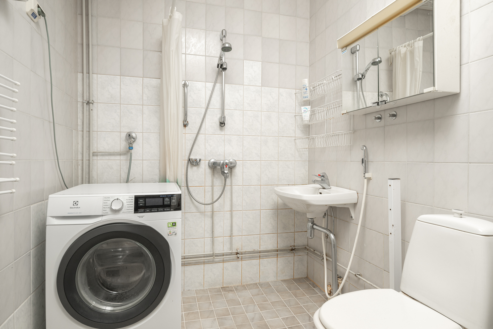 WC-istuin, pesukoneliitäntä, peilikaappi, suihku ja kiinteät valaisimet, seinät (kaakeli), lattiat (laatta) |