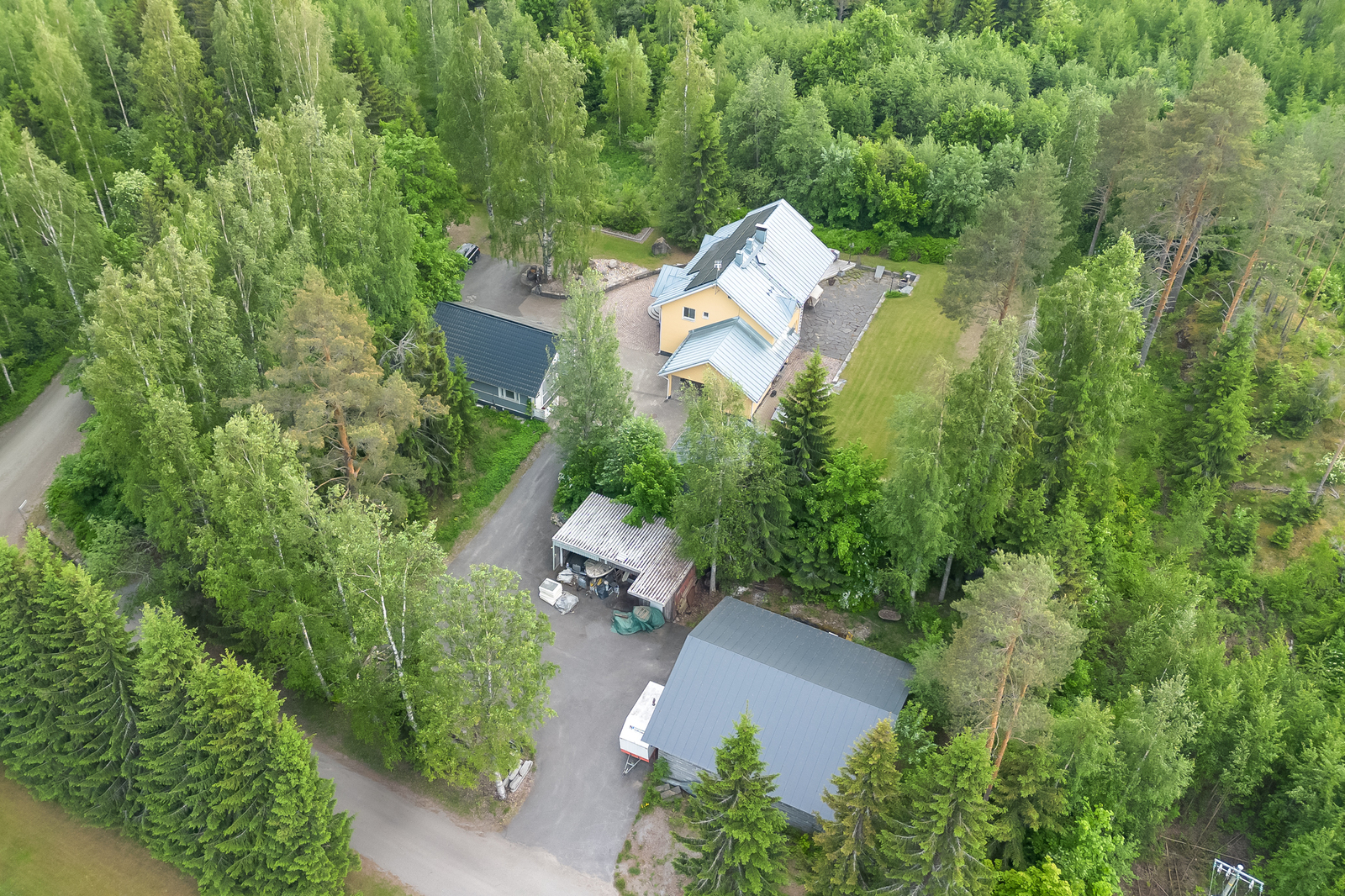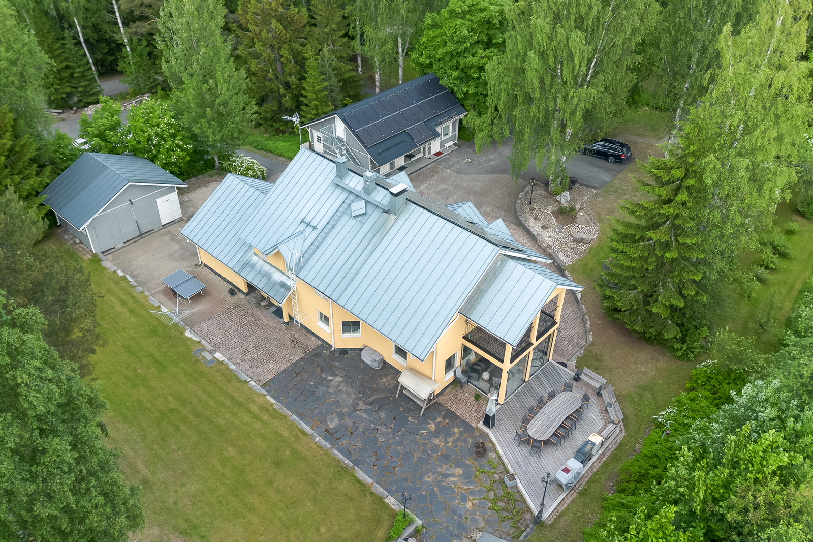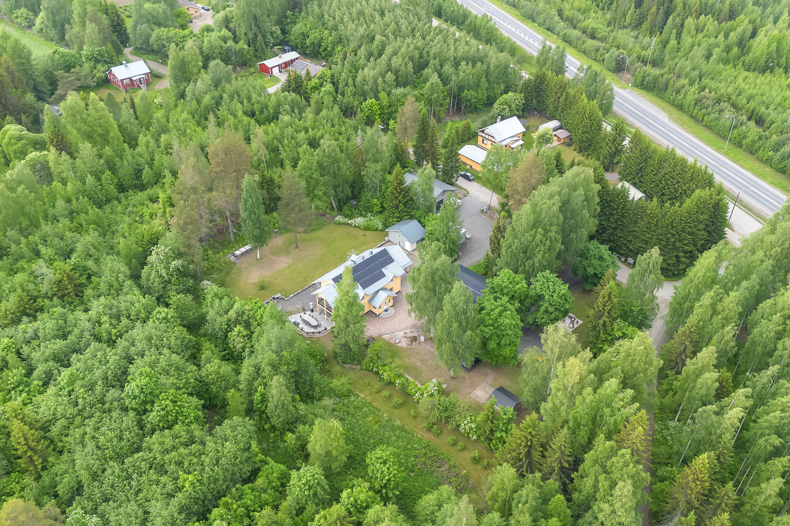 Asuinrakennuksen olohuoneessa on huonekorkeutta ruhtinaallisesti. Massiivisten ikkunoiden ansiosta luonnon valoa tulee vähän joka suunnasta. Saunatiloista löytyy puu-, sekä sähkökiuas. Rakennuksen maalämmössä myös viilennystoiminto kesähelteitä ajatellen. Asuinrakennuksen yhteydessä kahden auton katos. Majoitusrakennus myös maalämmössä, siellä lämpöpatterit, joissa on sähköinen puhallin. Majoitusrakennuksen kosteissa tiloissa sähkökaapeleilla lämmitys. Myös majoitusrakennuksessa viilennystoiminto, joka toimii radiaattoreiden (puhaltimien) kautta. Autotallirakennuksen lämmitys sähköllä, toteutettuna vesikiertoisella lattialämmityksellä ja valmius maalämmölle (kaivo jo olemassa). Koko tontilla on kolme maalämpökaivoa (omakotitalolla ja majoitusrakennuksella omat kaivot). Sähkönkulutus koko kiinteistöllä 32275,68 kWh/v ja tähän sisältyy myös talousrakennusten (mm. majoitusrakennuksen vuokraajien sähkönkäyttö) lämmittäminen. Sähkölaskujen kuluja pienentää suuri v. 2018 asennettu 17kW:n aurinkopaneelijärjestelmä. Puuta ei ole poltettu omakotitalossa kuin muutamia kertoja vuodessa tunnelman luomiseksi, joten sähkönkulutus ei todellakaan ole paljoa rakennusten kokoon ja käyttöasteeseen suhteutettuna.