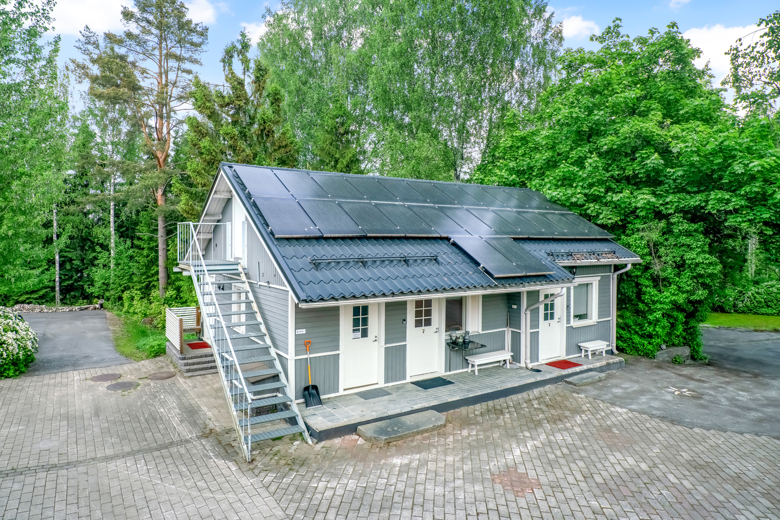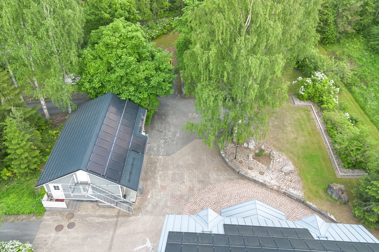 – Aurinkopaneelijärjestelmä 17kw-järjestelmä, joka toimii kahdella erillisellä invertterillä. Toinen majoitusrakennuksen teknisen tilan seinällä ja toinen asuinrakennuksen päädyssä olevan autokatoksen ullakkotilassa.