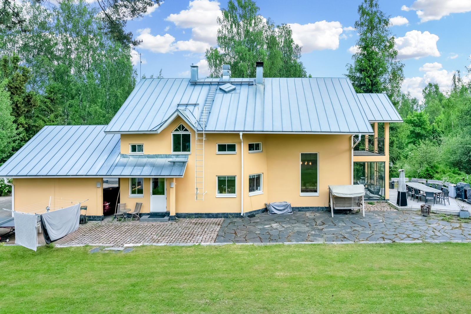 Niittylahden Pitkämäestä, laadukas, suuri ja ainutlaatuinen kokonaisuus. Tähän upeaan kokonaisuuteen kuuluu kaksikerroksinen lekaharkosta rakennettu 203 m² ja maalämpöön liitetty omakotitalo, sekä neljä erillistä talousrakennusta. Näistä neljästä talousrakennuksesta yksi on tehty majoitustoimintaa varten ja sekin on liitetty maalämpöön. Tämä rakennus tarjoaa neljä vuokrahuonetta, jotka ovat kaikki varustettu omalla wc:llä ja suihkulla. Lattiamateriaaleina laadukas ja arvokas Merbau parketti. Tähän rakennukseen on uusittu lähes kaikki v. 2020 (mukaan lukien kaikki pinnat, kylpyhuoneet jne.). Majoitustoiminta tuottaa n. 50€/yö/huone. Vuositasolla vuokraa on tullut 15 000 – 20 000€. Toinen talousrakennus toimii kylmävarastona omakotitalon ja majoitusrakennuksen vieressä. Kolmas talousrakennus on teräsrakenteinen katos, jonka yhteydessä on merikonttivarasto. Tähän katokseen mahtuu isompi ajoneuvo tai esimerkiksi vene. Neljäs talousrakennus on harkkorakenteinen lämmin autotalli/varasto, jonka yhteydessä autokatos. Tämä autotalli on jokaisen ajoneuvoharrastajan unelma, sillä se tarjoaa kaikki tarvittavat puitteet harrastamiseen. Huonekorkeutta on reilusti ja lattiat kestävät ajoneuvonostureita. Lisäksi pihapiiristä löytyy perinteinen puuliiteri.