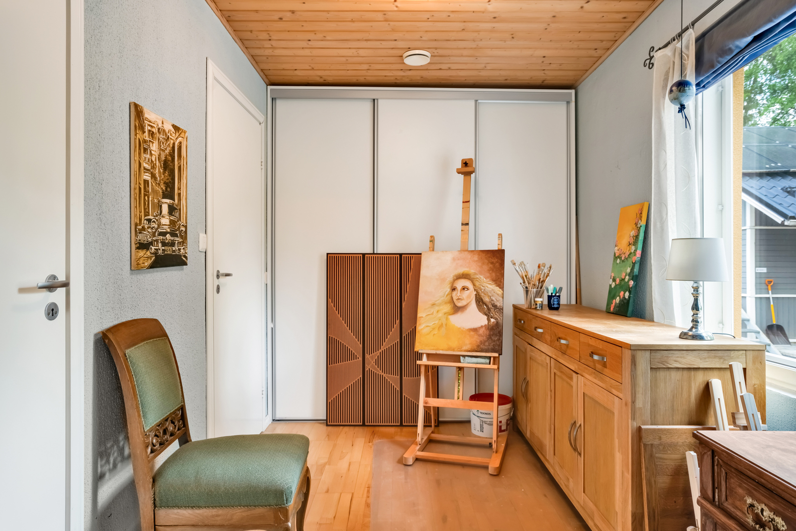 Tuulikaapissa laattalattia ja maalatut seinät. Eteisessä parkettilattia ja luonnonkivestä tehty koriste lattiaan. Seinät maalatut. Yläkerran vaatehuoneissa maalatut seinät ja toisessa laminaattilattia ja toisessa muovimatto. Alakerran vaatehuoneessa muovimatto ja maalatut seinät. |