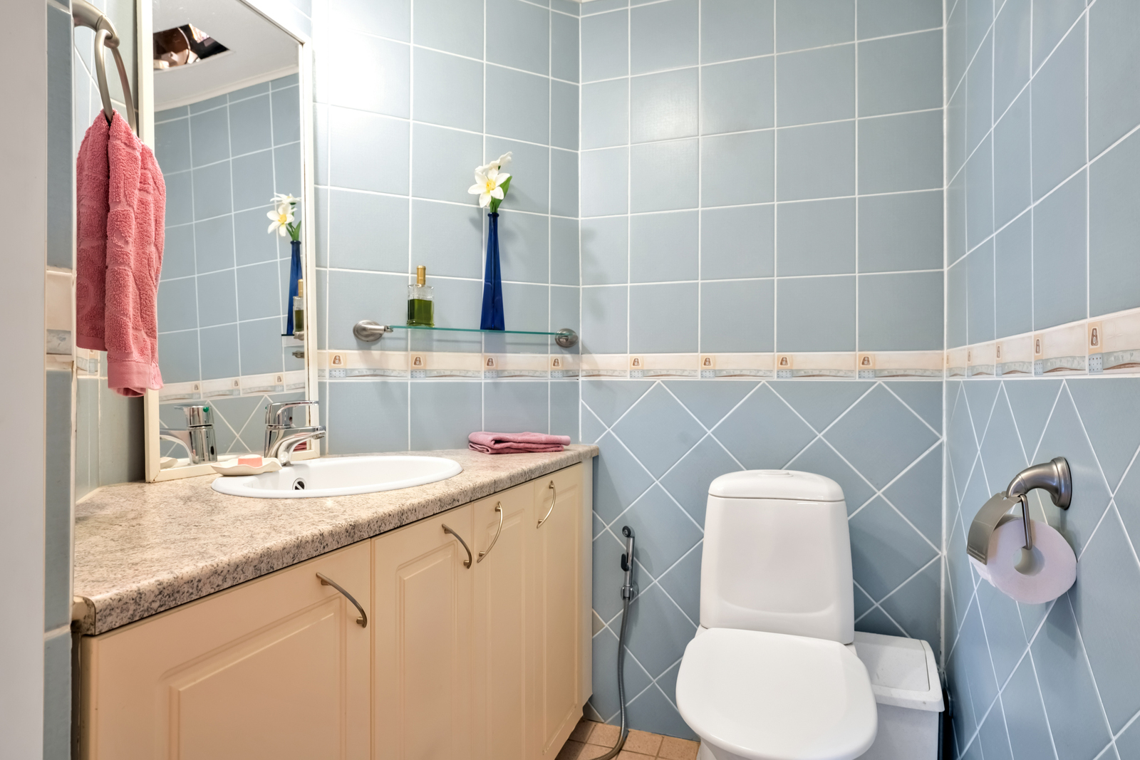 Lukumäärä: 2, Lattiakaivo, lattialämmitys, bidee-suihku ja peilikaappi, seinät (Kaakeli), lattiat (Laatta) |