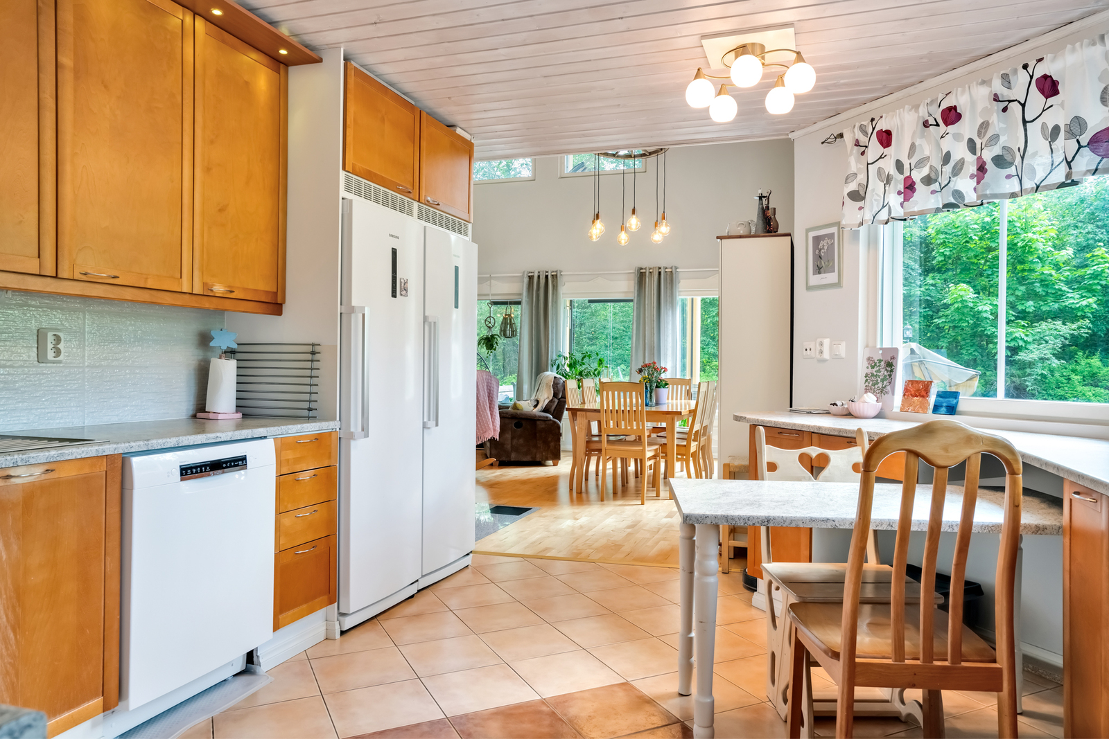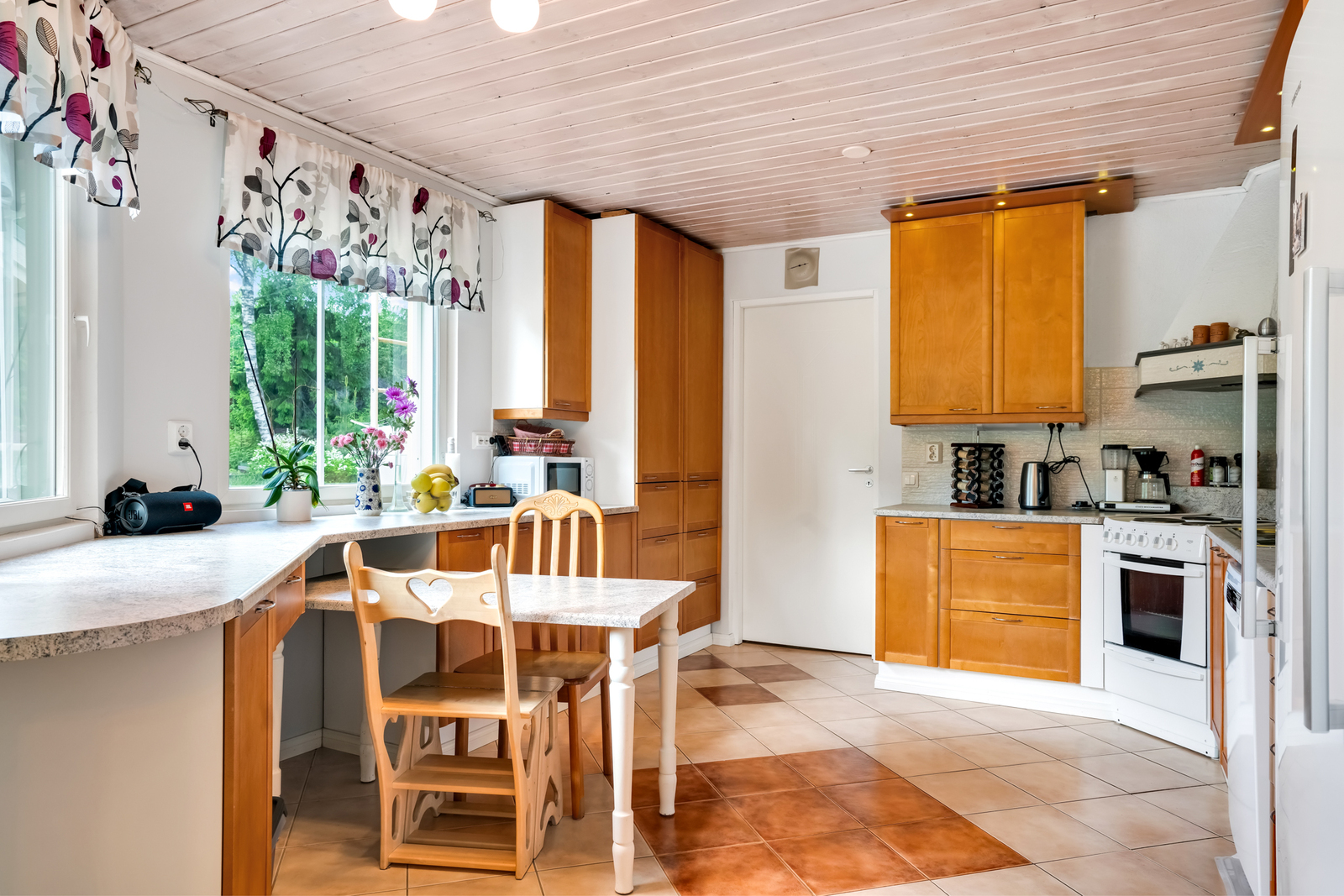 Liesi (muu), työtasot (laminaatti), seinät (laatta ja maali), lattiat (laatta), liesi, jääkaappi, astianpesukone, erillinen pakastin ja liesituuletin / hormi, kiinteät valaisimet |