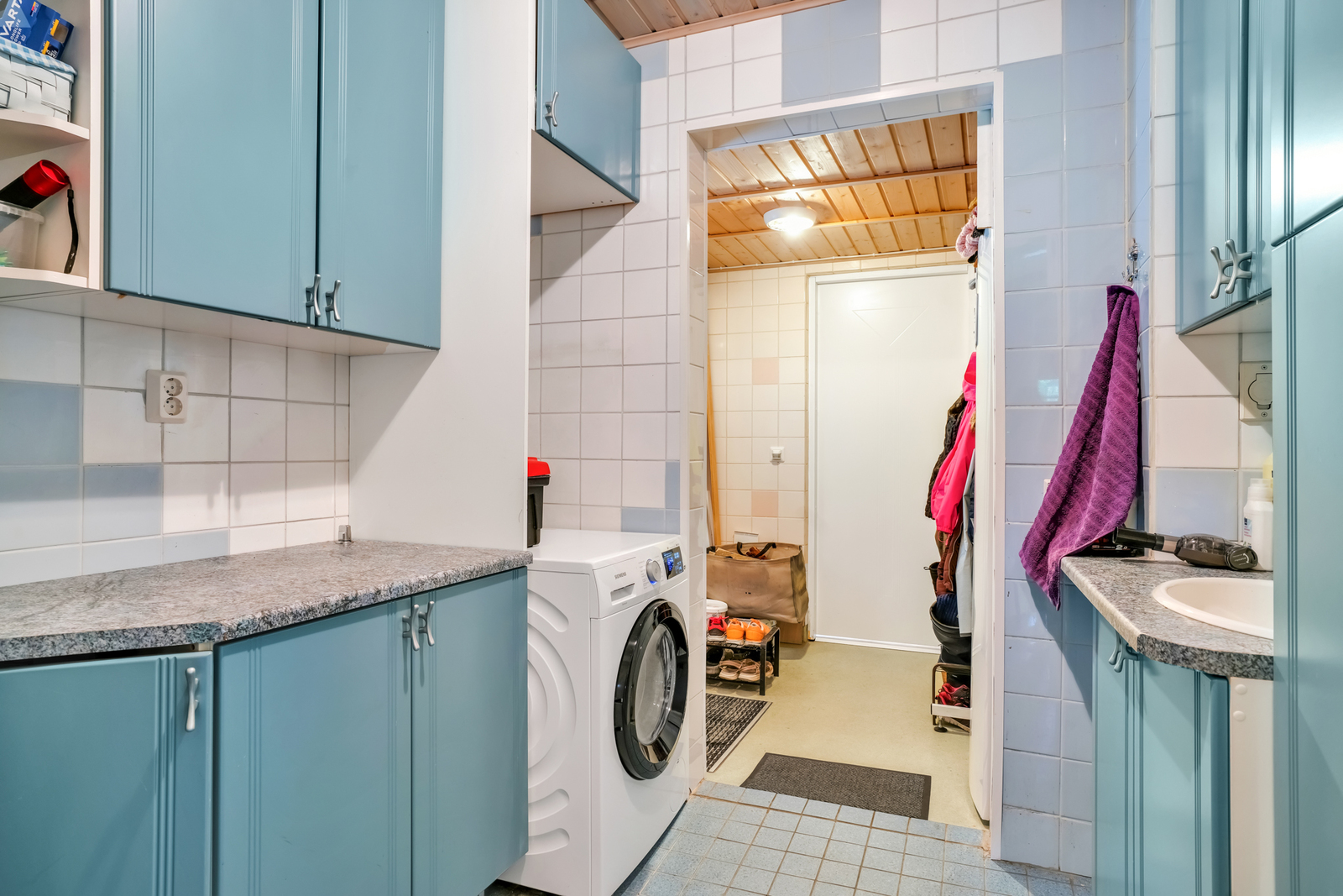 Pesukoneliitäntä, pesuallas, lattiakaivo, keskuspölynimuri, pyykkikaapit, pöytätaso, kurapiste, lattialämmitys ja pesukone, lattiat (laatta), seinät (kaakeli), Kuraeteinen/tekninen tila kodinhoitohuoneen ja ulko-oven välissä. |