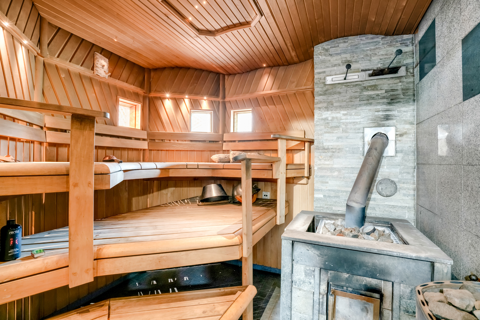 Seinät (kivi ja puu), lattiat (laatta), Puukiuas, Kuituvalot, joiden väri mahdollista vaihtaa. |
