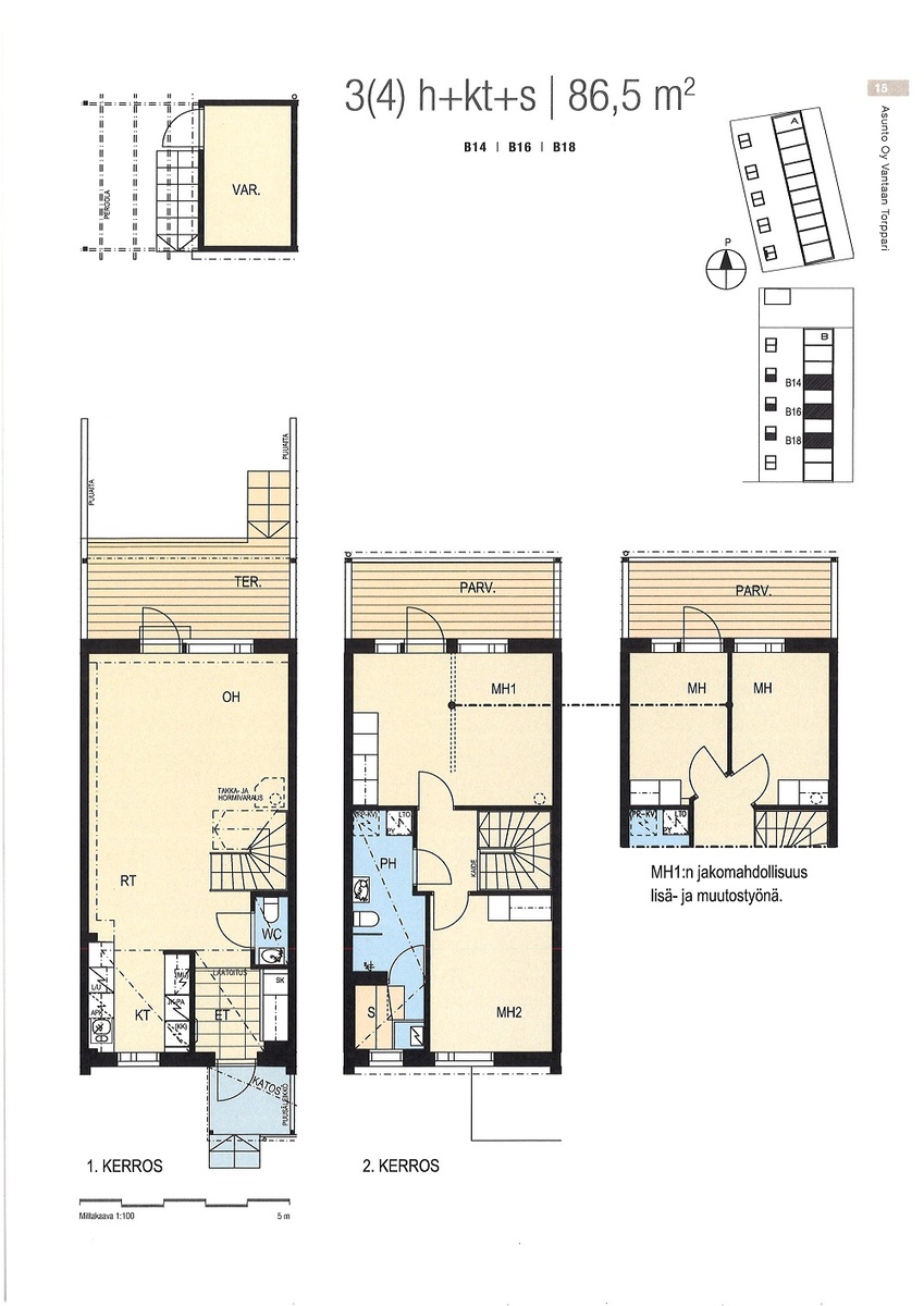 | Huoneistoselitelmä | 3 ( 4) h, avokeittiö, pesutilat, s, erill.wc, piha, varasto ( yht.järj. 3 ( 4) h + kt + s). |
