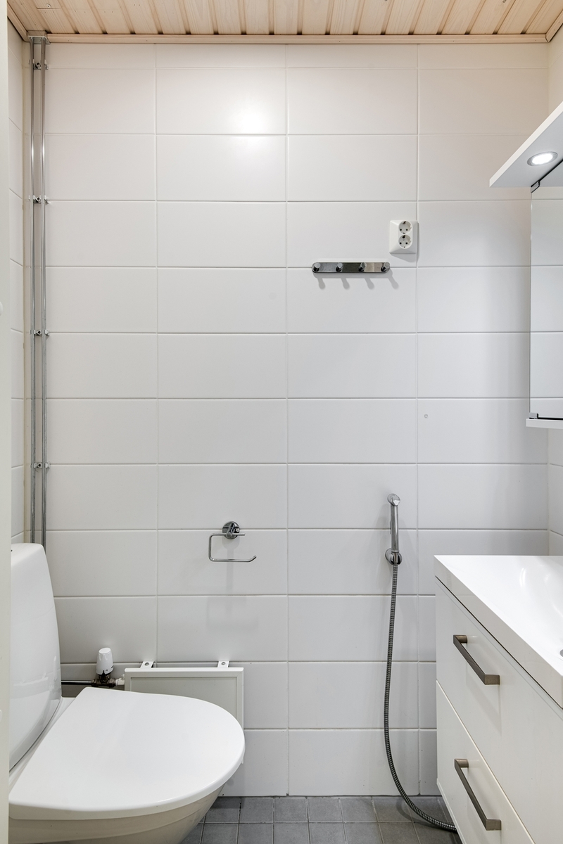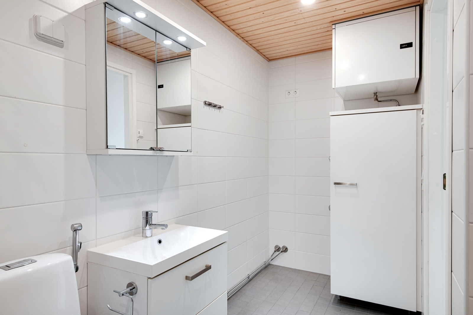 | Kylpyhuoneen kuvaus | Peilikaappi, pesukoneliitäntä, lattialämmitys, wc-istuin ja kiinteät valaisimet, lattiat (laatta) |