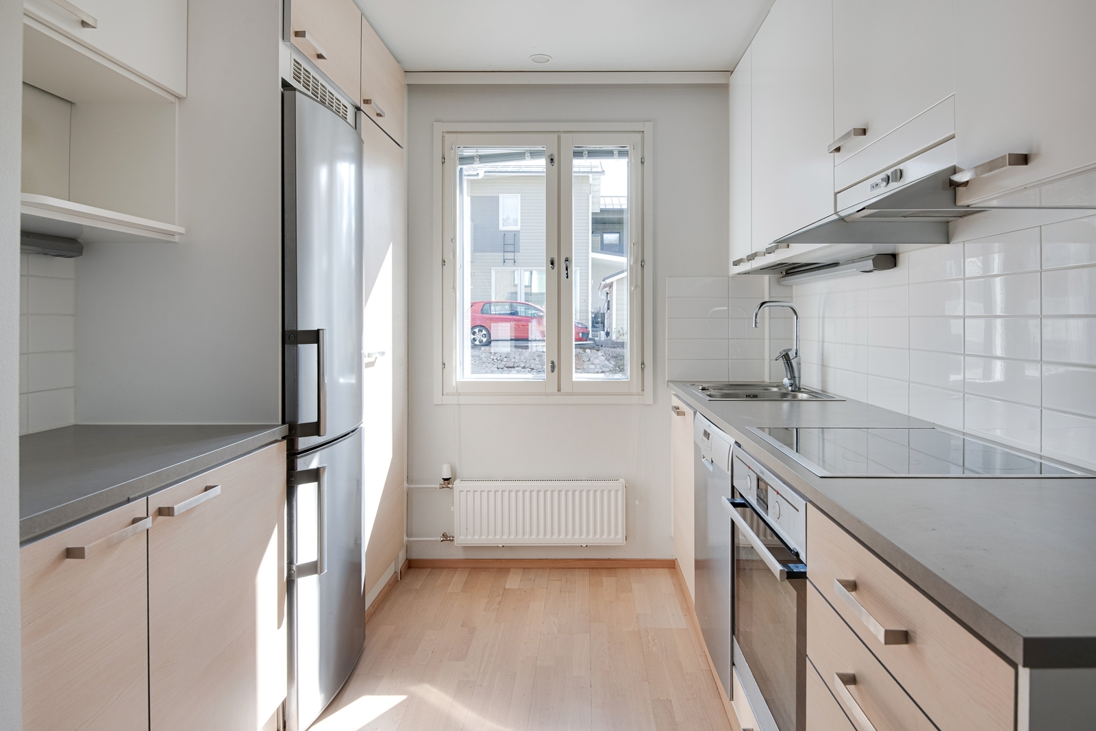 | Keittiön kuvaus | Liesi (Keraaminen liesi), lattiat (parketti), jääkaappi, liesituuletin, erillinen pakastin ja astianpesukone |