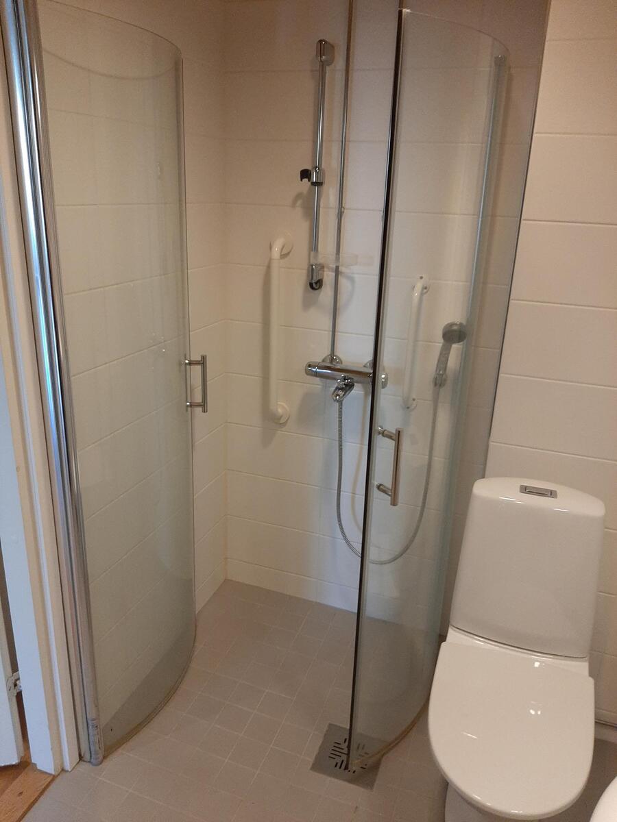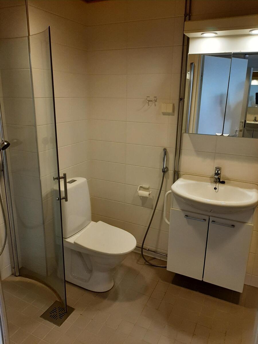 Lattialämmitys, peilikaappi, suihku, wc-istuin, pesukoneliitäntä, suihkukaappi ja asennettuja erikoisvarusteita, kiinteät valaisimet, seinät (kaakeli), lattiat (laatta) |