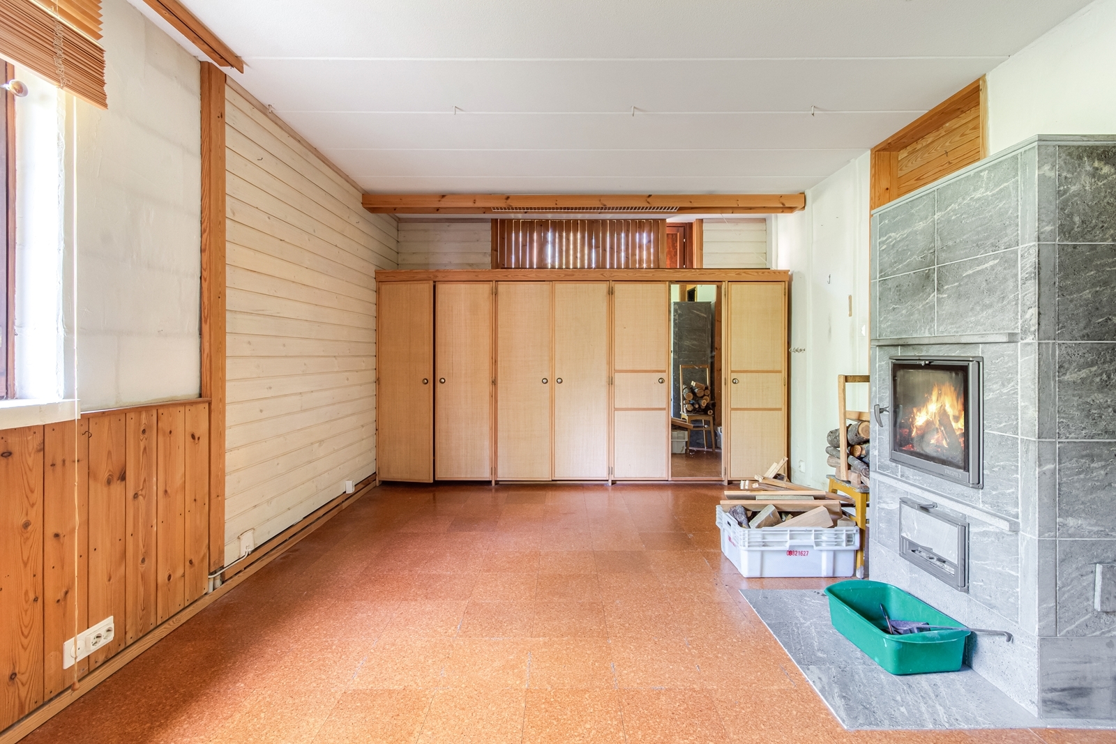 | Olohuoneen kuvaus | Seinät (puu ja kivi), Kokolattiamatto 1-2 kerroksen välissä on pieni aulatila Seinäpinnat: puulevy, kiveä Sähköpatterit olohuoneen seinän keskiosassa |