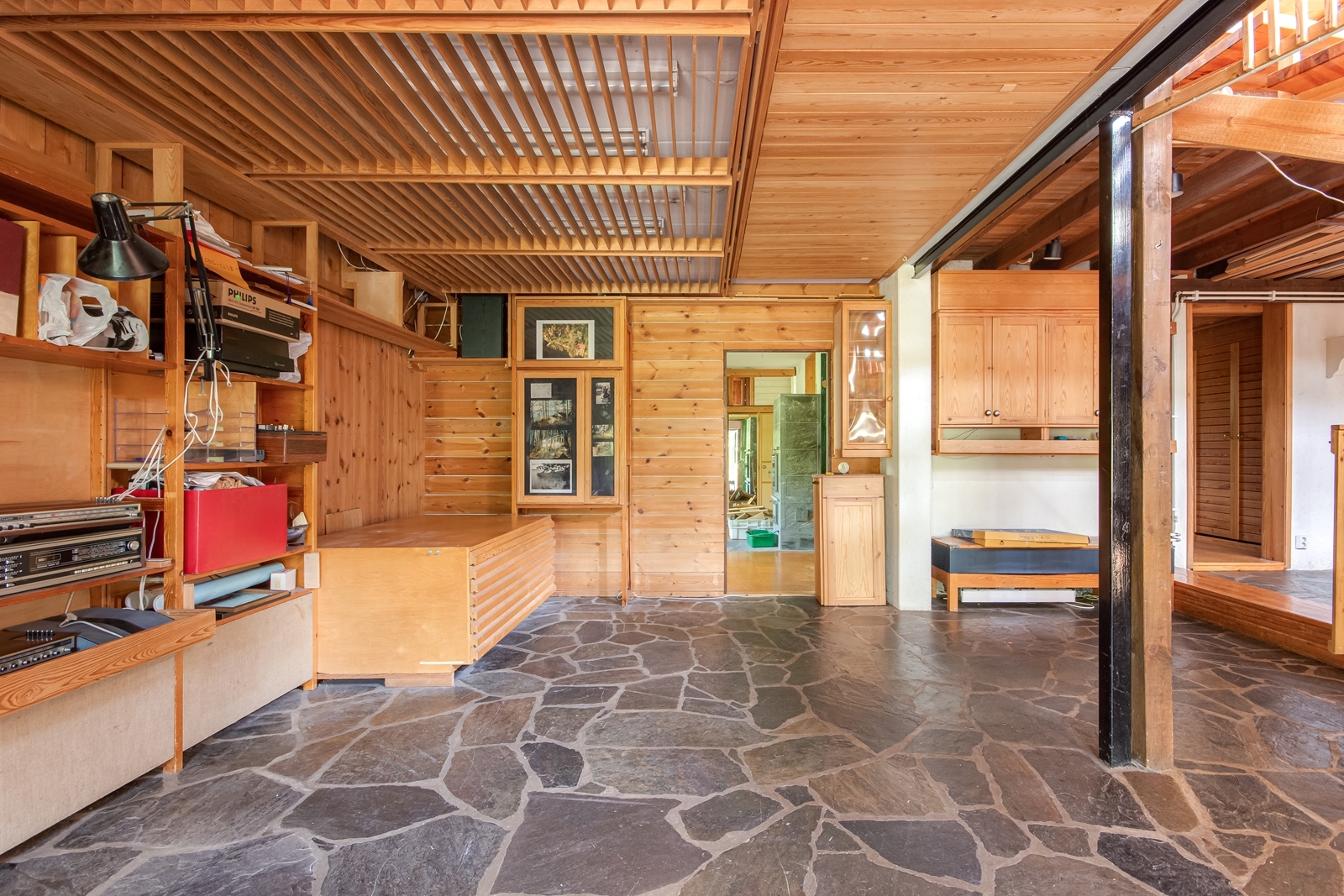 Alakerrasta löytyy allasosaston lisäksi tilava olohuone/työtila, jossa on liuskekivilattia, takka sekä näyttävä lasiseinä allasosastolle päin. Lisäksi alakerrassa on yksi makuuhuone varaavalla takalla, toinen kylpyhuone, kodinhoitohuone sekä pienempi huone esimerkiksi työtilaksi tai vierashuoneeksi.