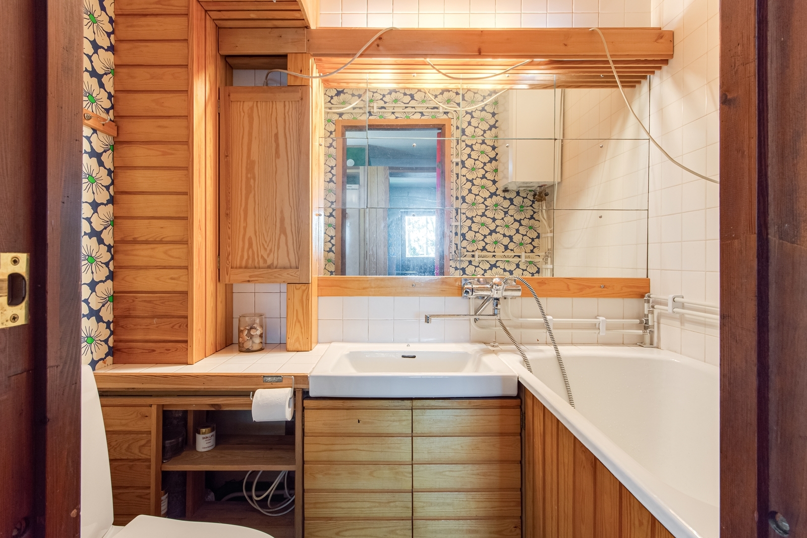 | Kylpyhuoneen kuvaus | 3 kylpyhuonetta 1. Kylpyhuone uima-altaalla – Lattia: muovimatto, ja lattialämmitys – seinät: puupaneeli, kivi – 2 suihkua – Sauna: sähkökiuas, hirsisauna – Uima-allas (betoni, pinnoitteella) – Erillinen wc 2. Seinät: tapetti, puupaneelia Lattia: muovimatto Wc, lavuaari, amme 3. Wc, suihku, Lattia: muovimatto. Seinät: tapetti ja puupaneeli |