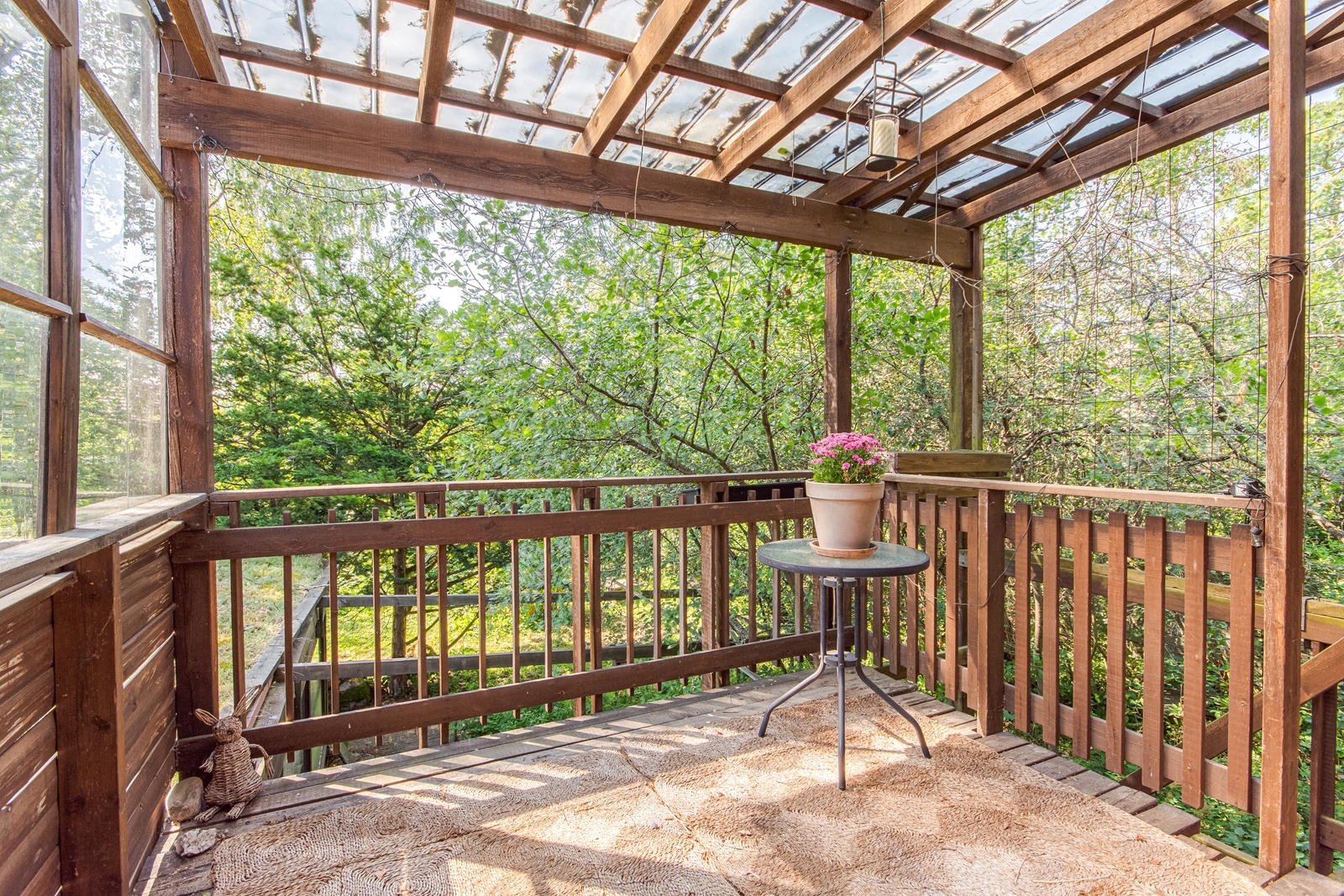 Yläkerrassa sijaitsee valoisa olohuone ja keittiö, joita kehystävät suuret ikkunat. Molemmista tiloista on käynti tilavalle kattoterassille, josta avautuu vehreät näkymät omalle pihalle. Kattoterassin yhteydessä on myös kasvihuone. Lisäksi yläkerrasta löytyy kaksi makuuhuonetta sekä kylpyhuone ammeella.