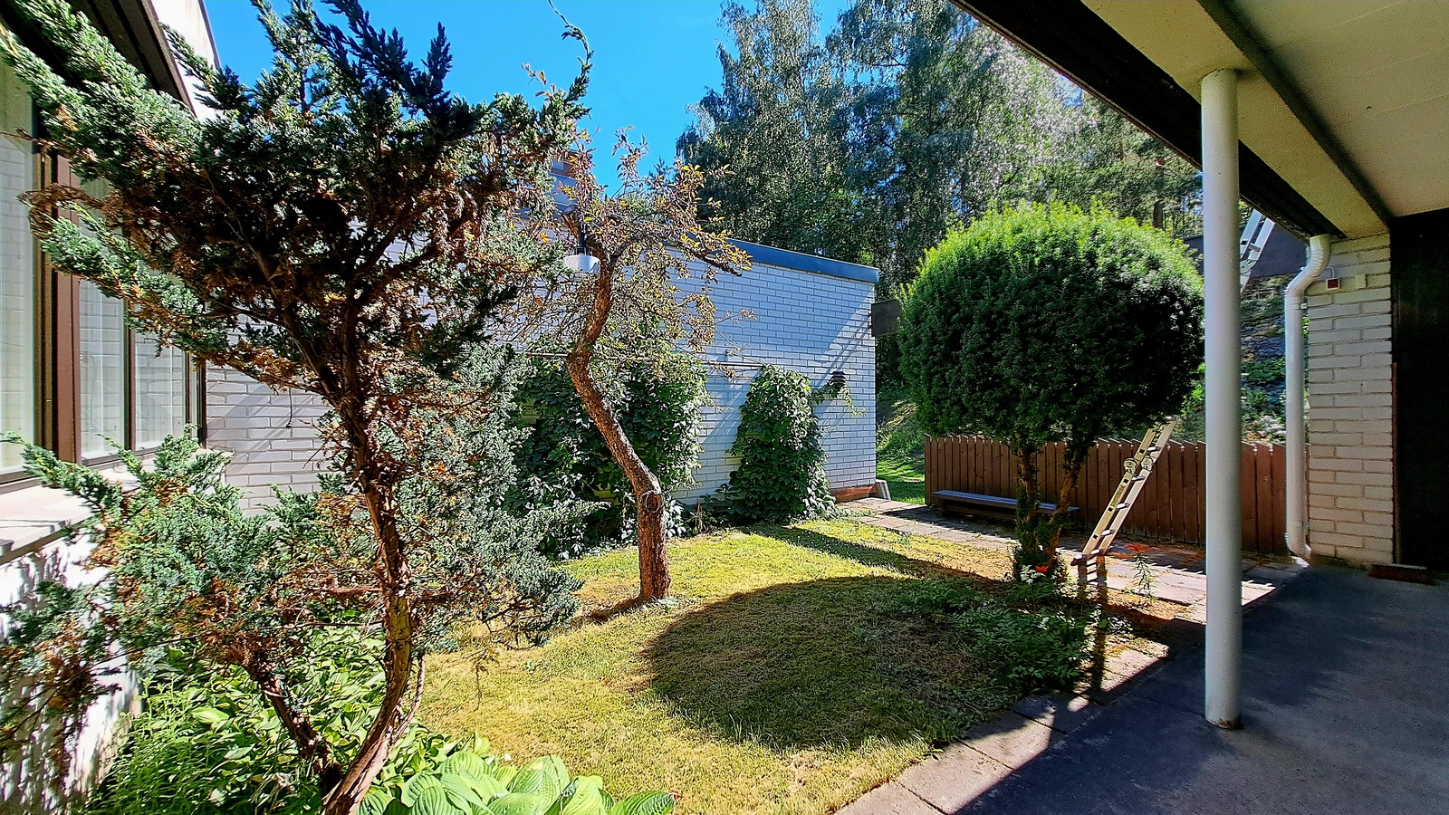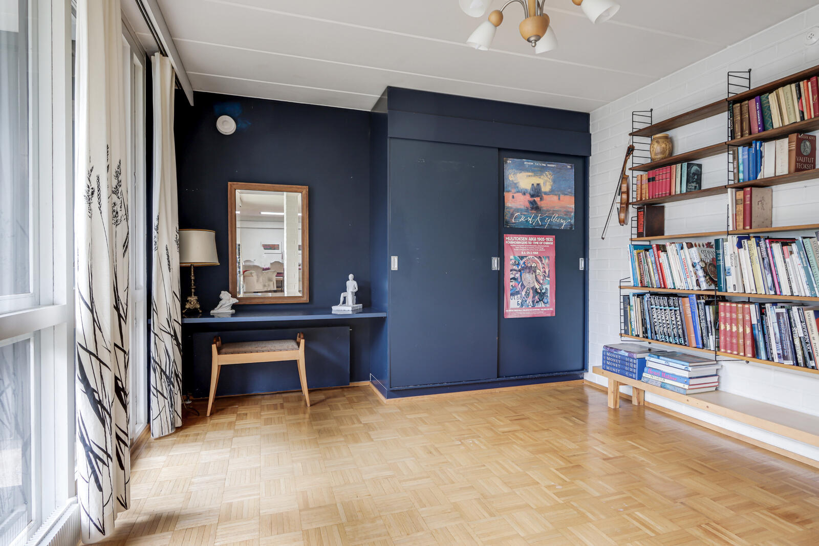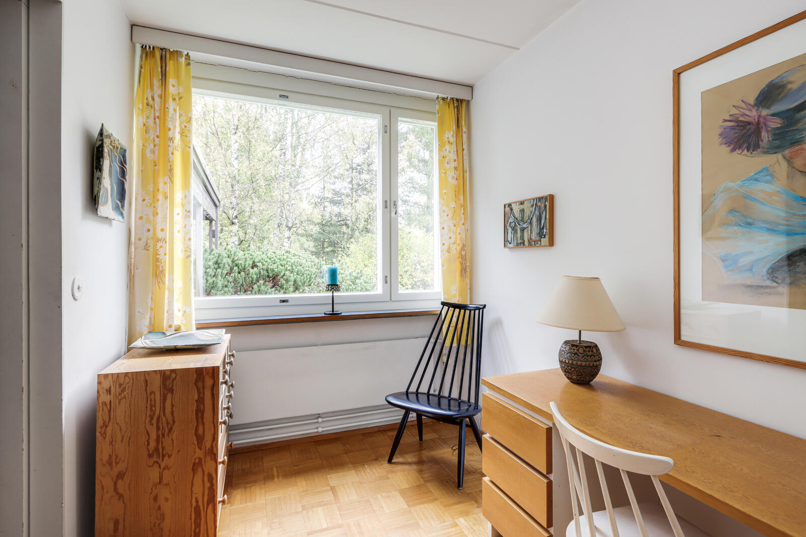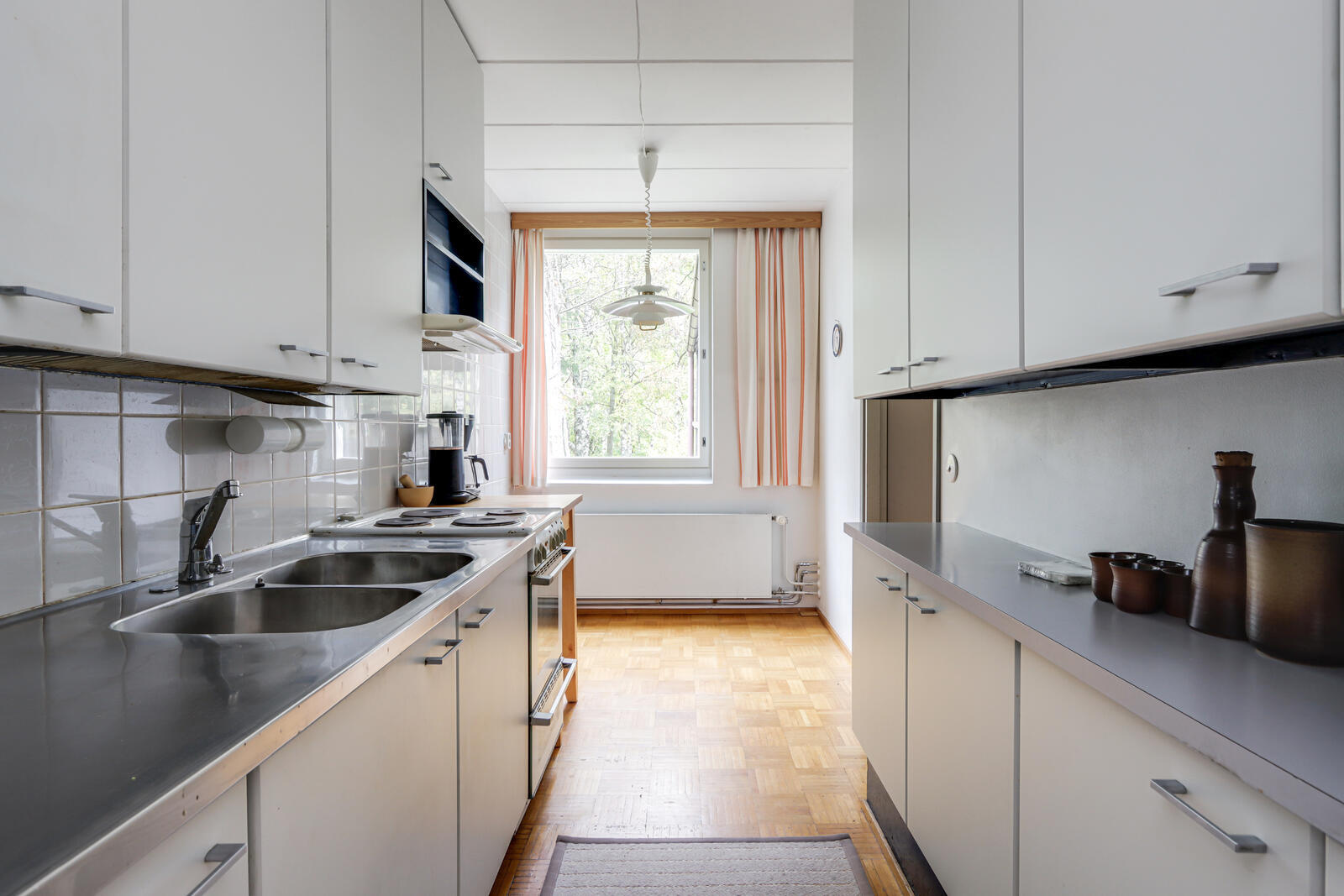 Viljo Revellin & Heikki Castrenin suunnittelema iso rivitaloyhtiö vuodelta 1969, tarjoaa loistavat mahdollisuudet suurenkin perheen tarpeisiin, tai upeaksi edustuskodiksi. Yläkerrassa on viisi huonetta ja avara olohuone, jonka yhteydessä on ruokailutila, avotakka ja ihastuttava atriumpiha. Tässä hyvin pidetyssä huoneistossa on asuttu pitkään ja siellä on säilynyt alkuperäinen tunnelma, koska sitä ei ole pilattu remonteilla, jotka eivät ehkä olisi sopineet talon aikakauteen ja arkkitehtuuriin.