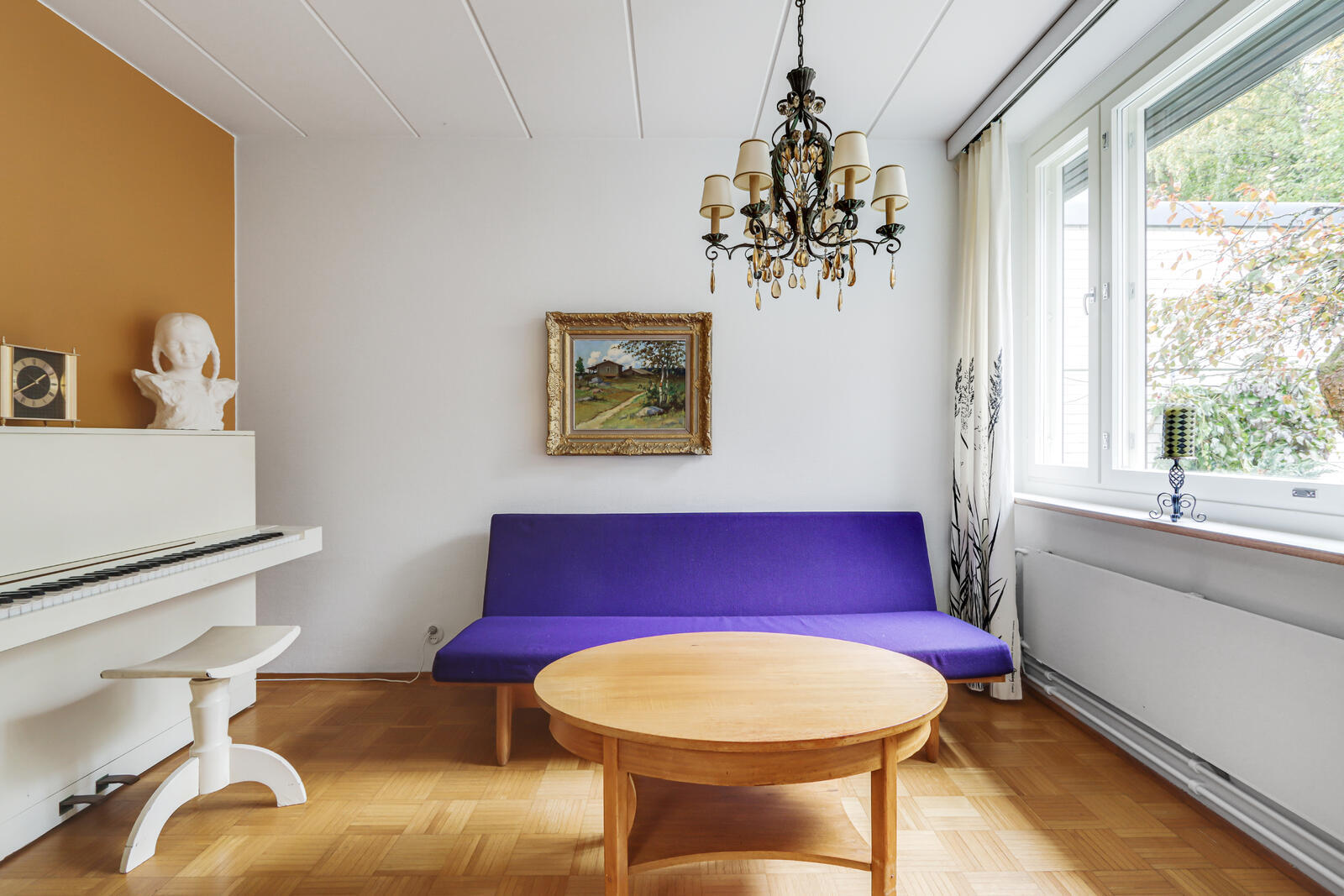 | Olohuoneen kuvaus | Yläkerran olohuone: lattia: tammimosaiikkiparketti, seinät maalattu |