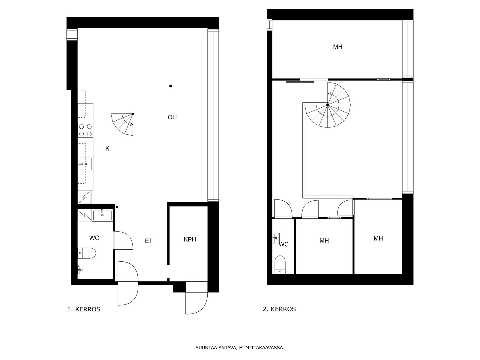 Huonekorkeus 5 metriä. Alakerta 68m2, yläkerta 45m2.