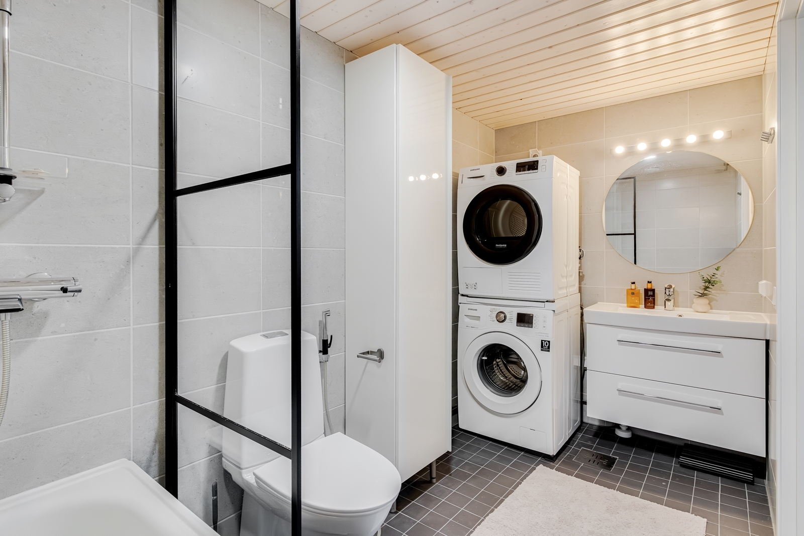 | Kylpyhuoneen kuvaus | Lattialämmitys, pesukoneliitäntä, suihkuseinä, kylpyamme ja wc-istuin, seinät (kaakeli), lattiat (laatta), Kylpyhuone uusittu 2022. |