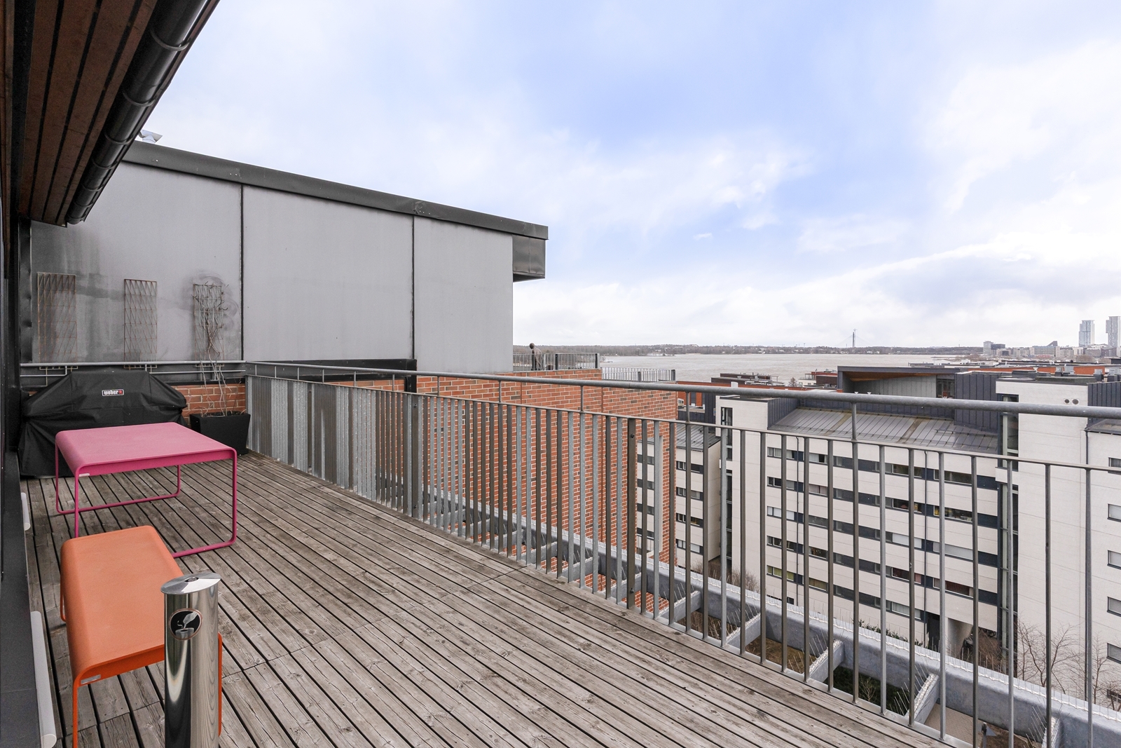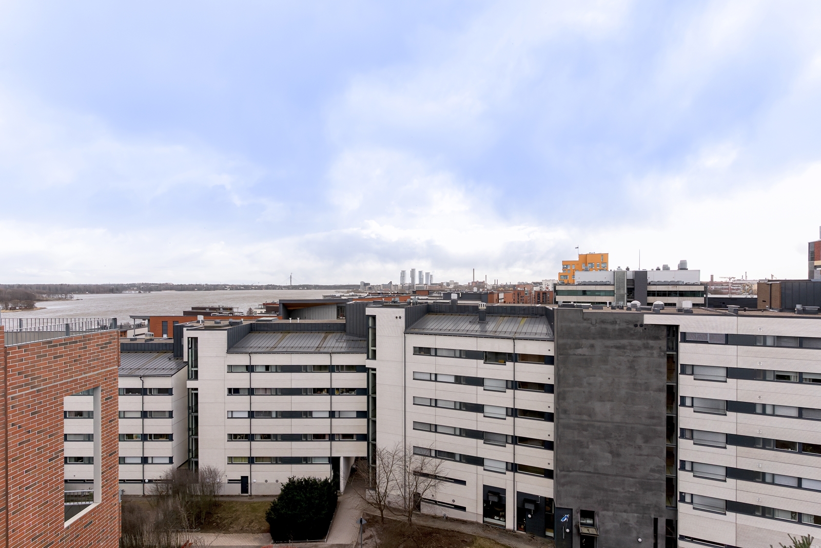 Yhtiössä upea kattoterassi ja näköalasauna, maisemat merelle/etelään/keskustaan.