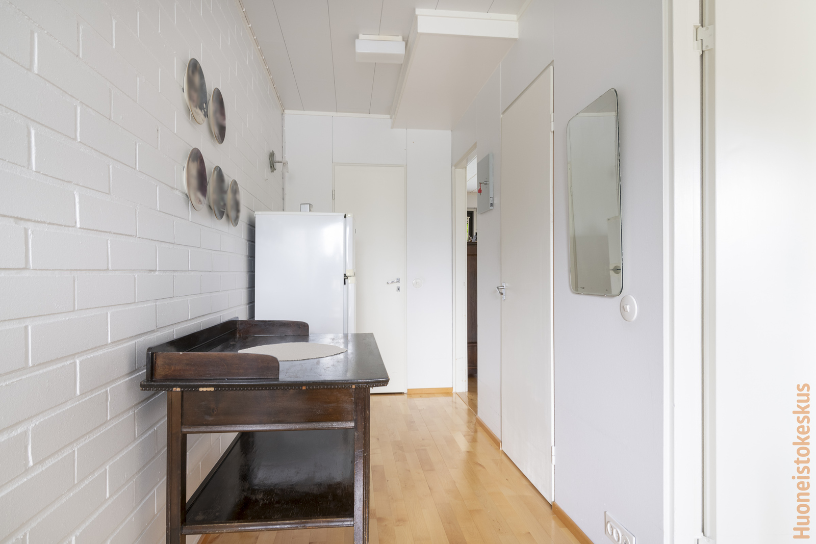 | Muut huoneet ja tilat | Huoneiden parkettilattia on loimukoivua. Eteisessä maalatut tiili-/levyseinät. Tuulikaapissa muovimattolattia, seinät maalattu. |