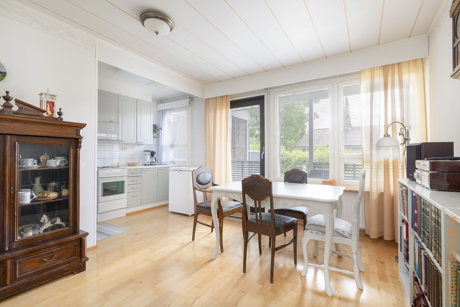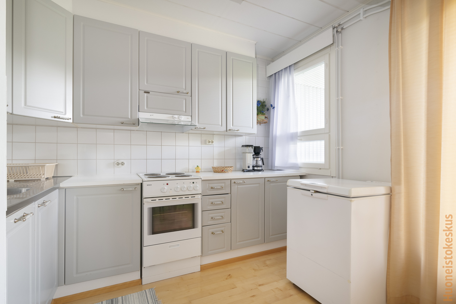 | Keittiön kuvaus | Liesi (Sähköhella), työtasot (laminaatti), seinät (maali), lattiat (parketti), erillinen pakastin, liesi, jenkkikaappi, liesituuletin ja kiinteät valaisimet |