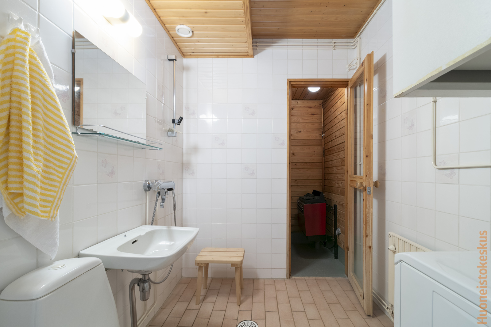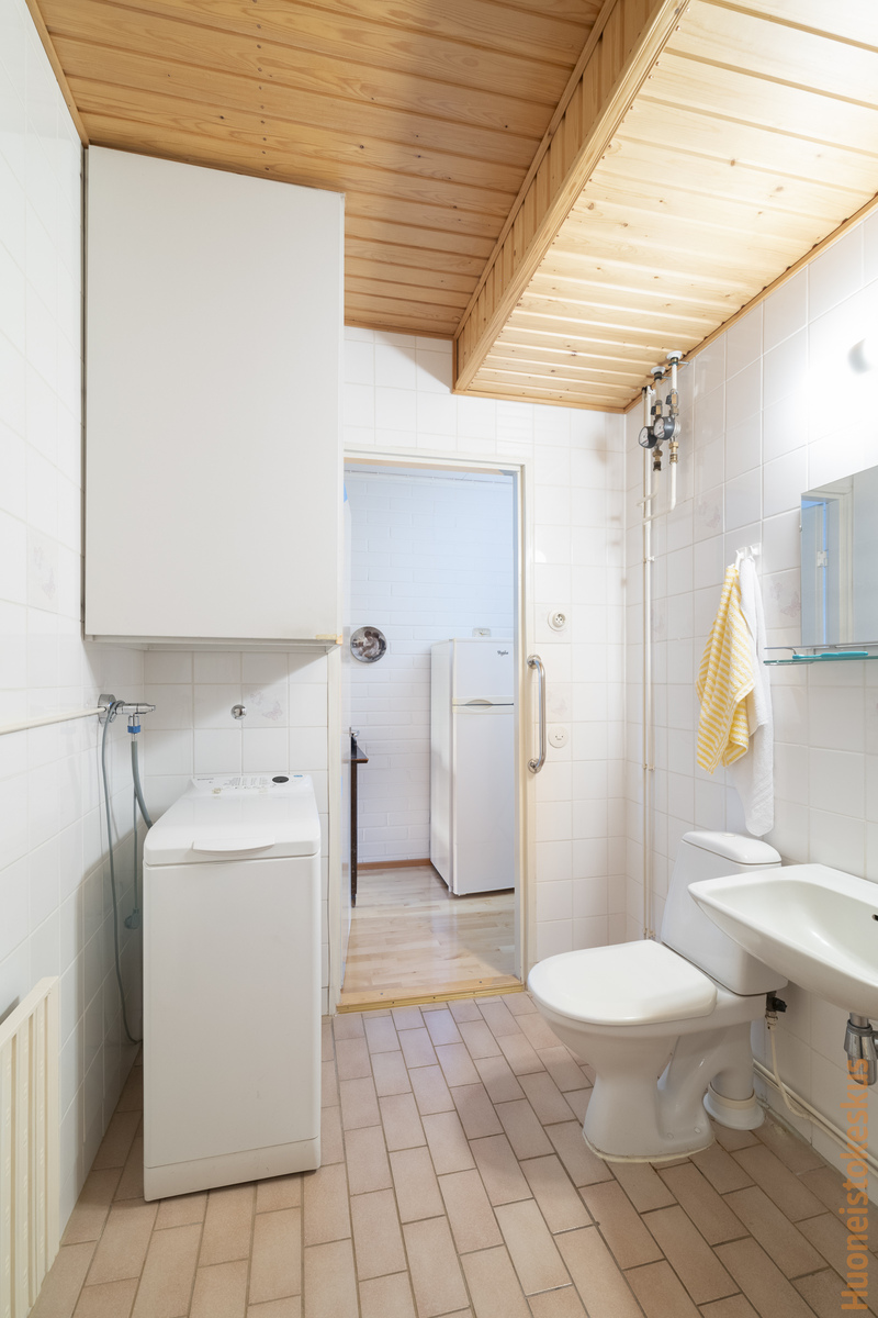 | Kylpyhuoneen kuvaus | Suihku, wc-istuin, pesukoneliitäntä ja kiinteät valaisimet, seinät (kaakeli), lattiat (laatta) |