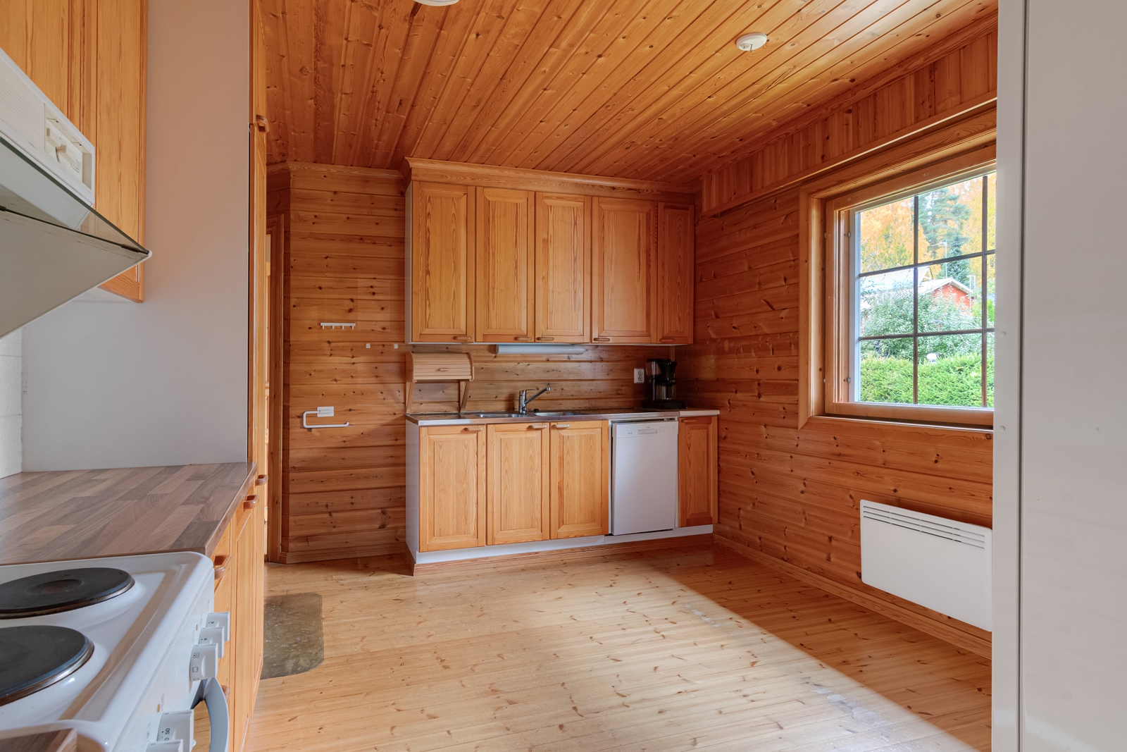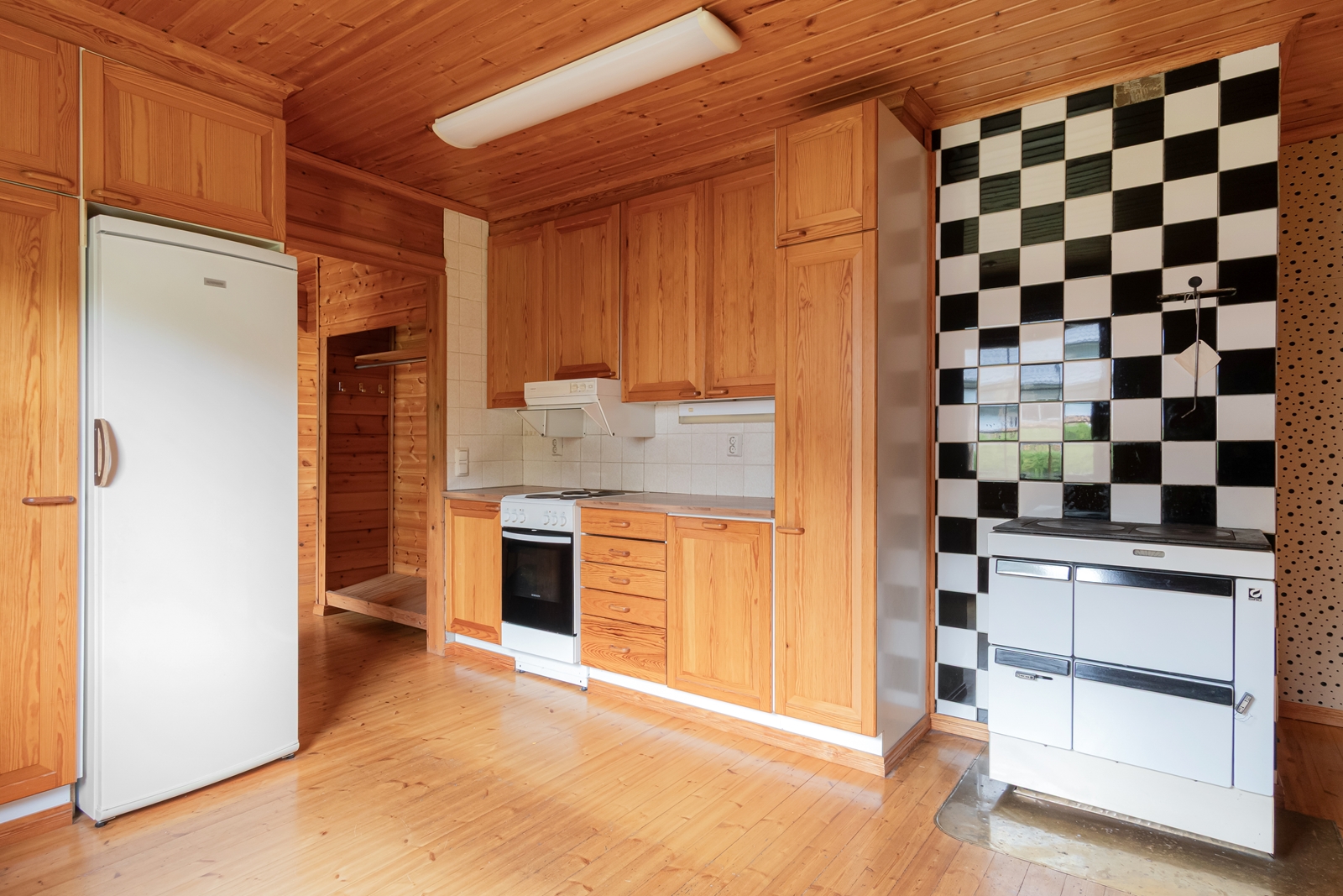 | Keittiön kuvaus | Liesi (Puuhella ja sähköhella), työtasot (laminaatti ja metalli), seinät (kaakeli ja puu), lattiat (lauta), jää-viileäkaappi, liesituuletin, astianpesukone ja liesi |