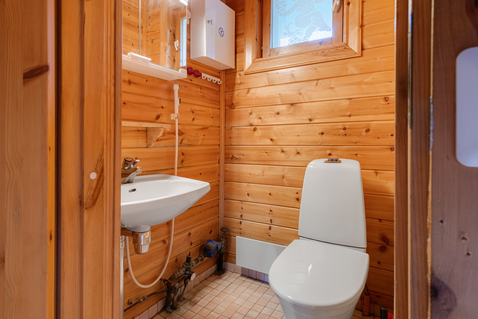 | WC-tilojen kuvaus | Lukumäärä: 1, Peilikaappi, lattiakaivo, bidee-suihku, wc-istuin ja lääkekaappi, seinät (Puu), lattiat (Laatta) |