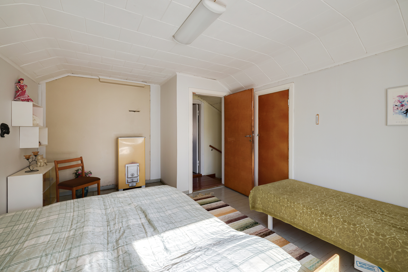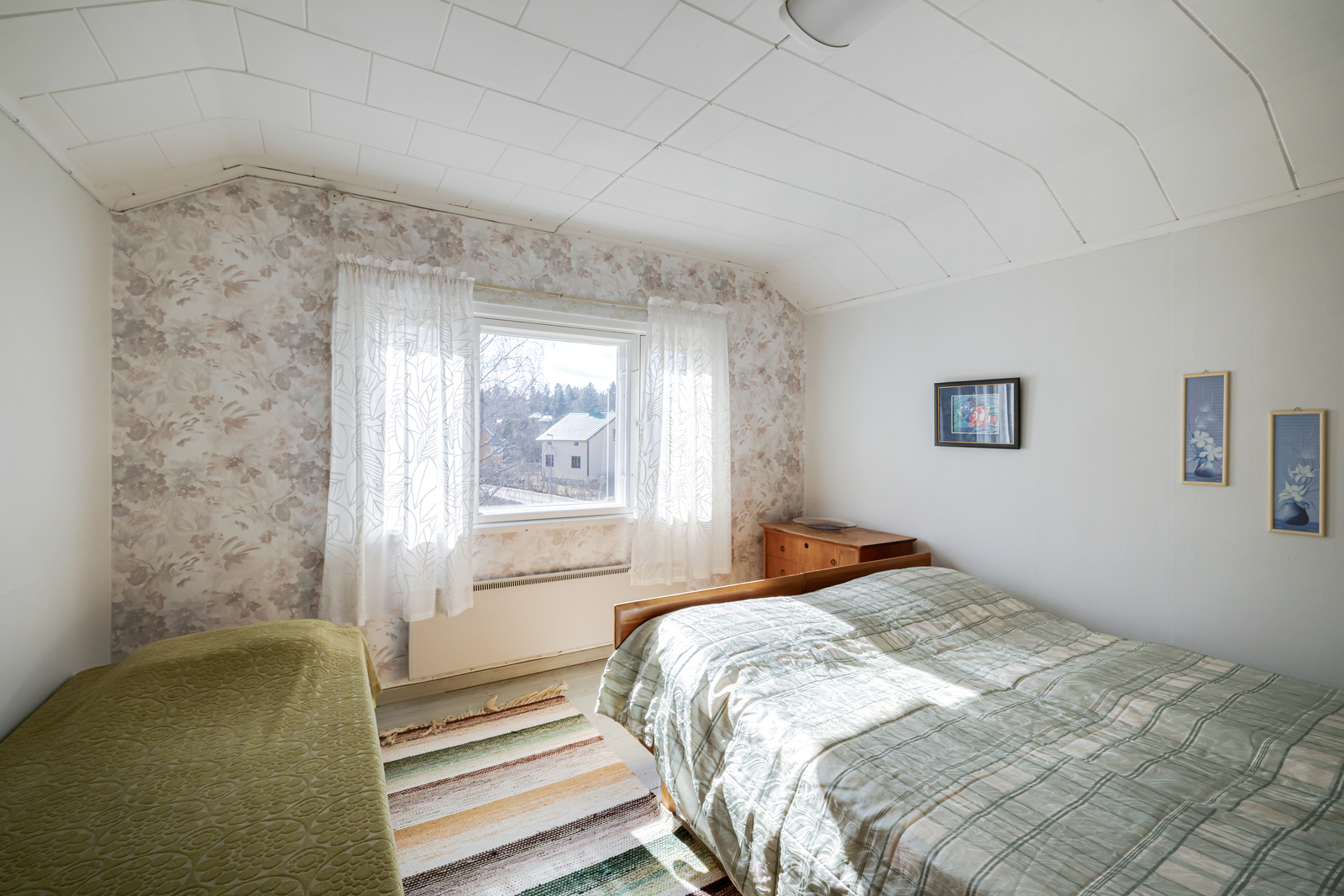 Alakerran makuuhuoneessa lattia laminaattia, yläkerran yhdessä makuuhuoneessa lautalattia ja toisessa muovimatto |