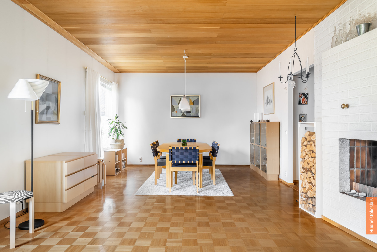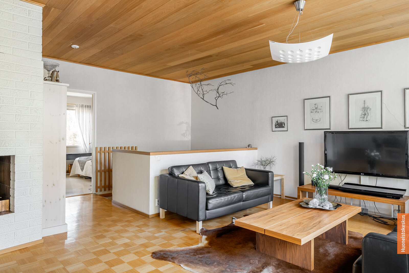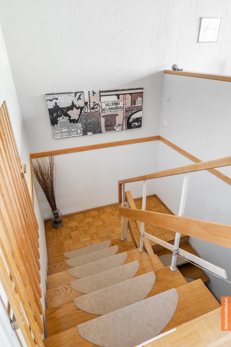 Yläkerrassa on oikeasti iso olohuone, joka on noin puolet yläkerrasta. Tässä tilassa on perheen sekä vieraiden helppo viihtyä, sillä tilaan mahtuu hyvin iso ruokailuryhmä, isot sohvaryhmät television viereen ja tilaa jää vielä paljon. Tilassa on myös näyttävä avotakka katseen vangitsijana. Huoneeseen tulee myös reilusti luonnonvaloa isoista ikkunoista valaisten hienon mosaiikkiparketin sekä näyttävän katon. Tilaan olisi remontilla mahdollista myös toteuttaa avokeittiö, sillä seinän takana on yläkerran kylpyhuone wc-tiloilla varustettuna. Tosin keittiö on nykyiselläänkin hyvin toimiva, sillä siellä on hyvin kaappi- sekä laskutilaa. Keittiöön mahtuu myös pienempi pöytä. Yläkerran sisäänkäynti on keittiössä, joten tämä tuo helppoutta kauppakassien kantoon. Yläkerrassa on myös kaksi makuuhuonetta, joista toinen on todella iso sekä varustettu hyvillä säilytystiloilla.