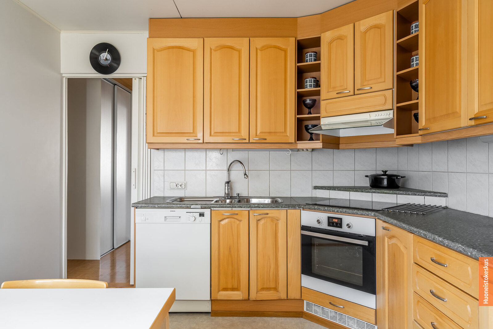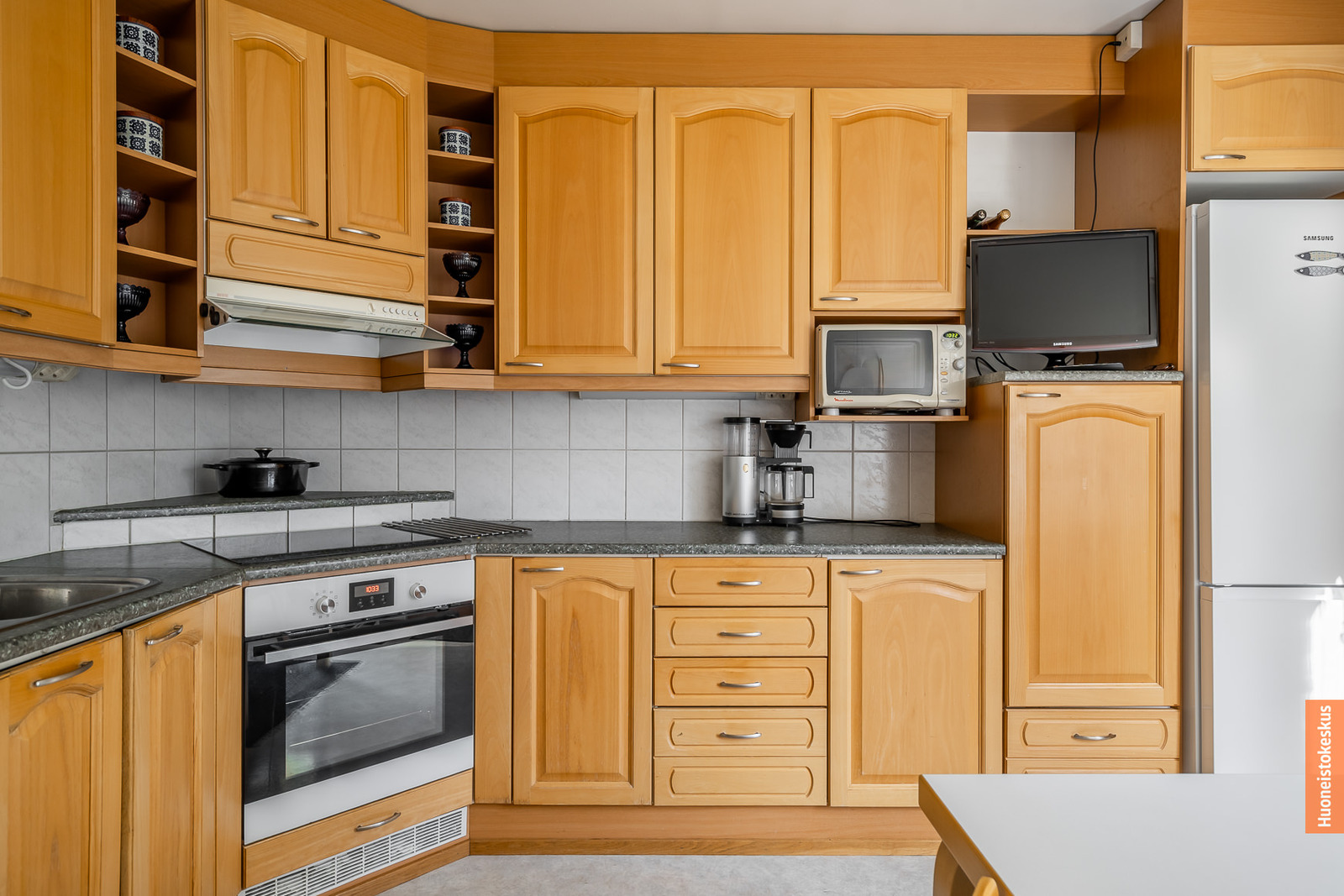 | Keittiön kuvaus | Liesi (Induktioliesi ja erillisuuni), työtasot (laminaatti), seinät (maali), lattiat (muovimatto), liesi, jääkaappipakastin, erillisuuni, liesituuletin, astianpesukone ja kiinteät valaisimet |