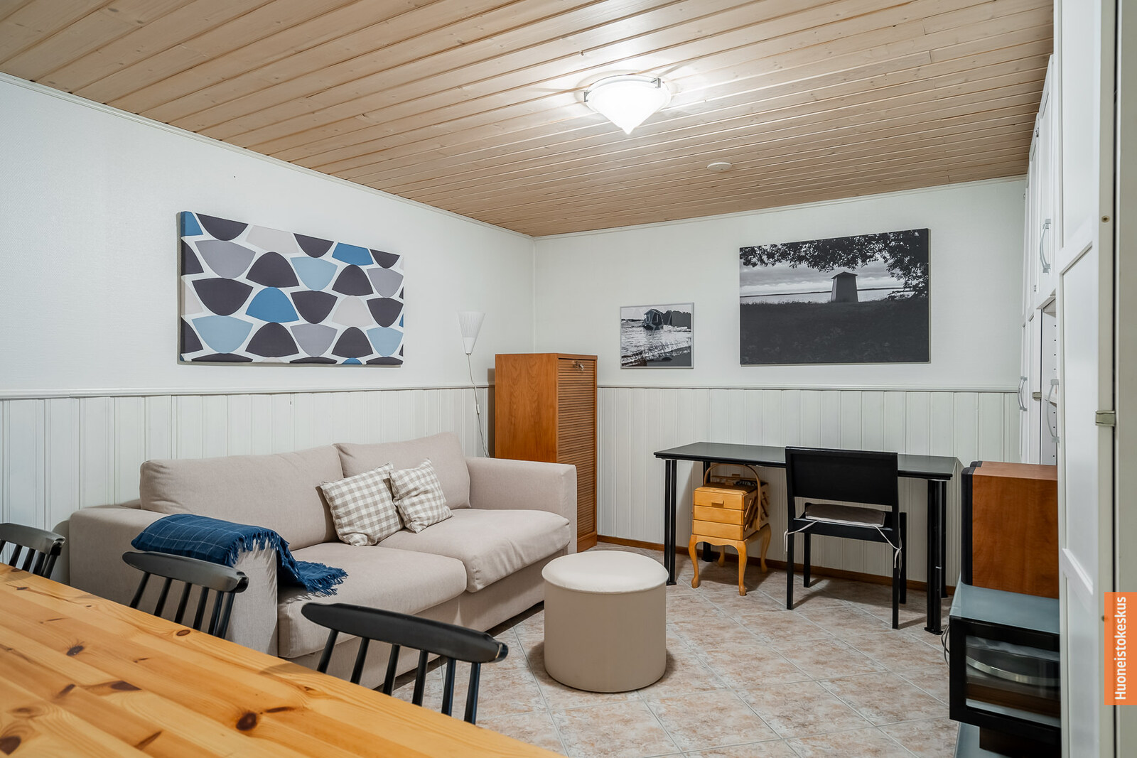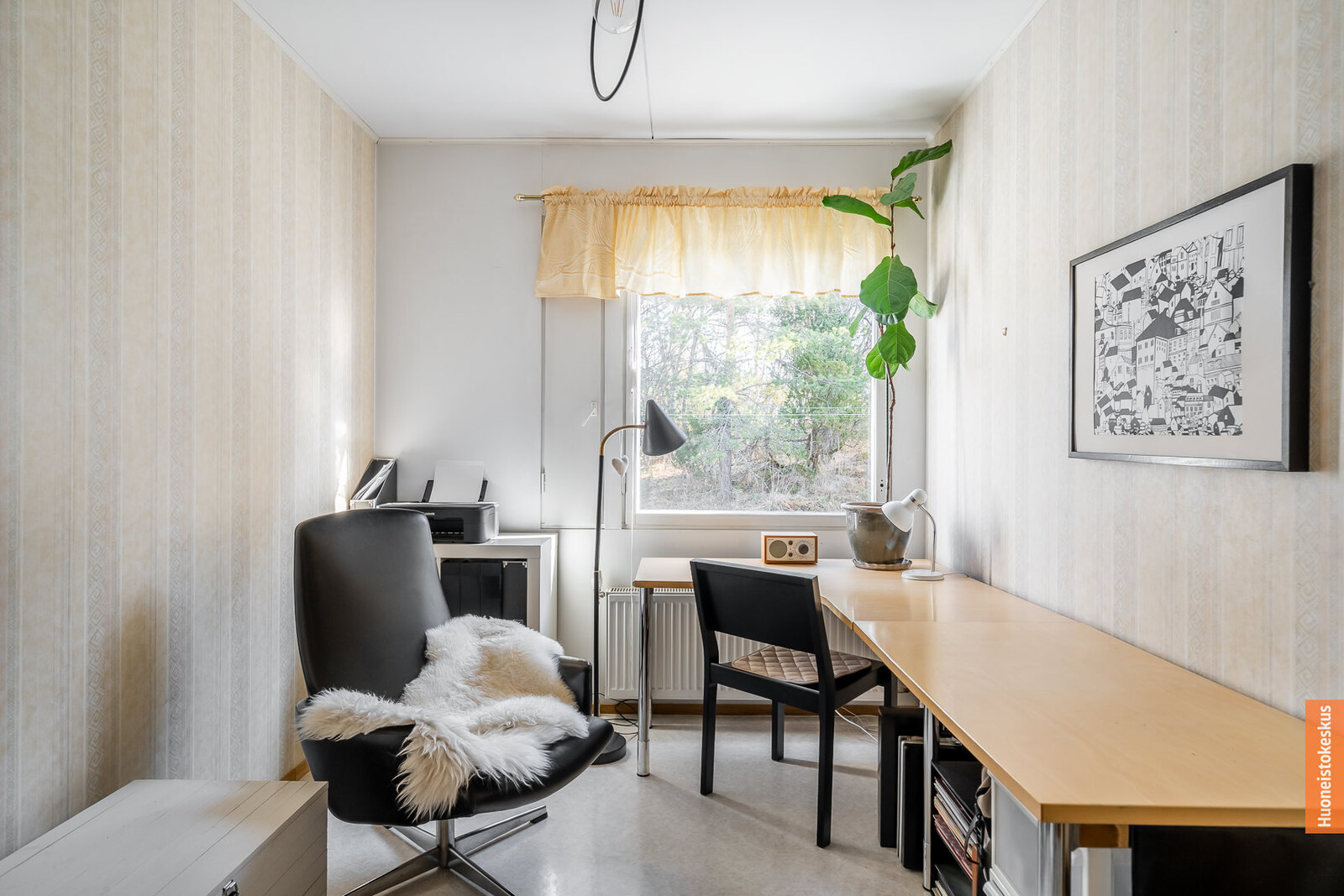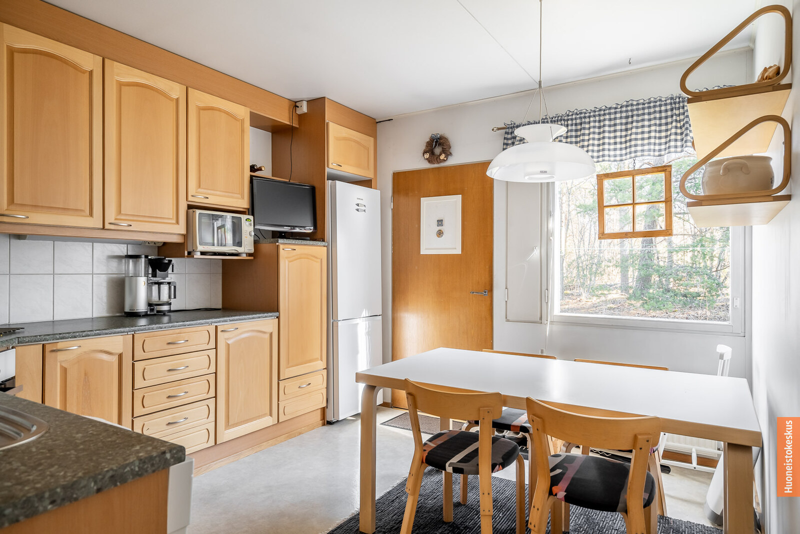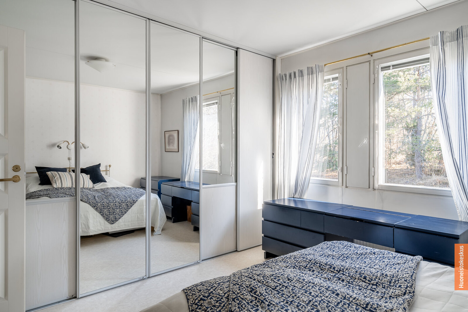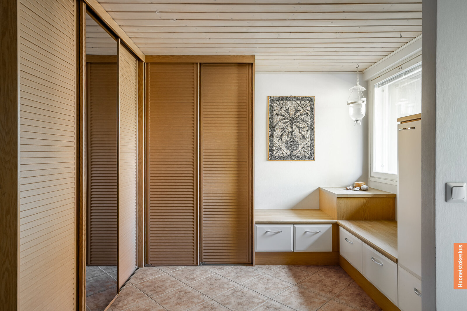 | Muuta kauppaan kuuluvaa | Alakerran rappusten viereissessä olevan huoneen Lundian kaapisto. Alakerran pieneen makuhuoneen peilikaappi. Lisätietoja sisältyvistä varusteista: kiinteät valaisimet, markiisi, sälekaihtimet/rullaverhot, verhotangot., (Kauppaan ei kuulu: Irtaimisto) |