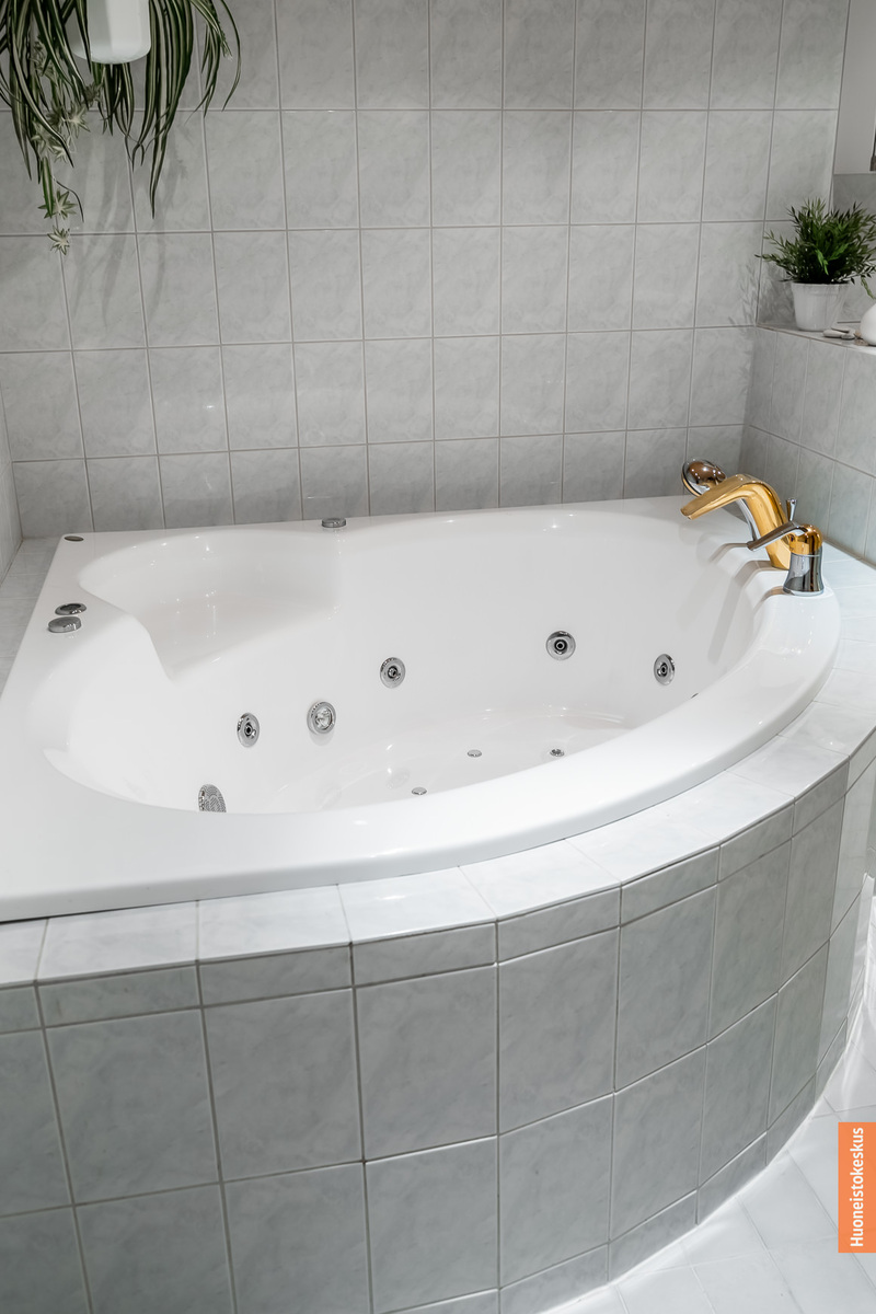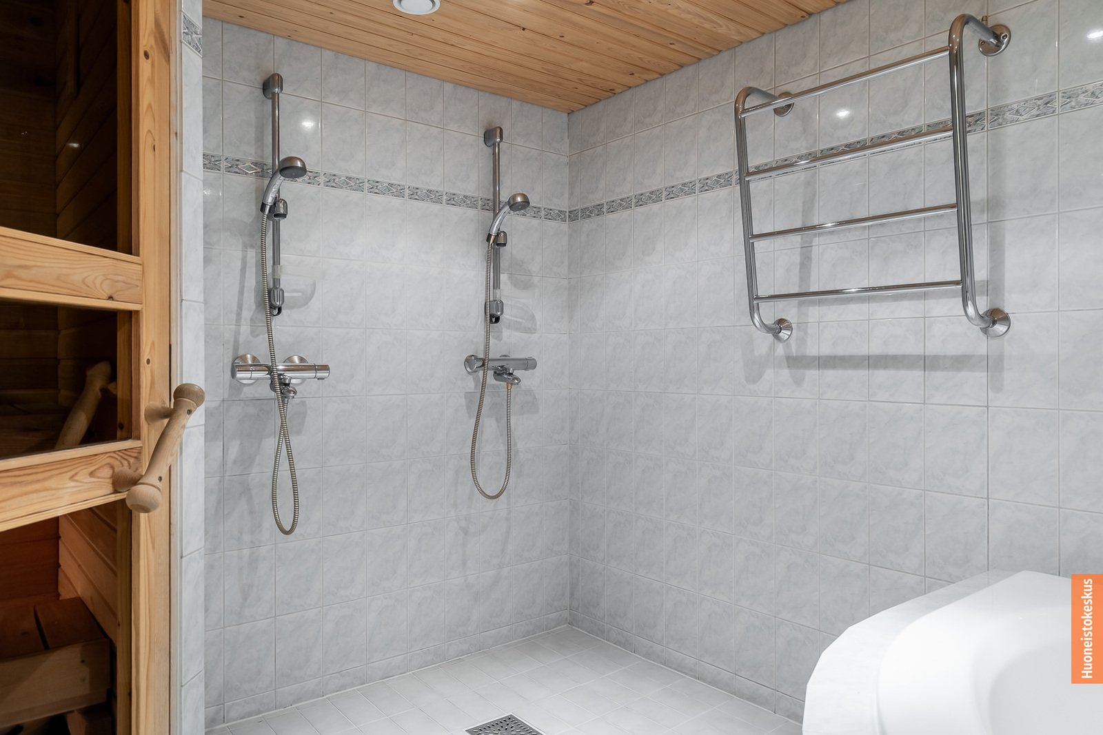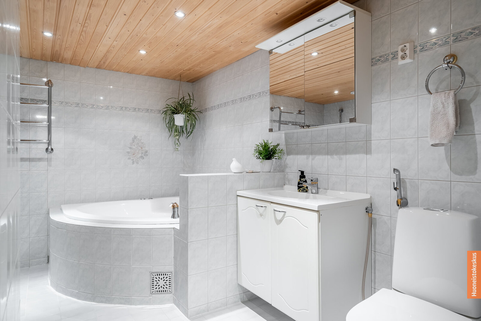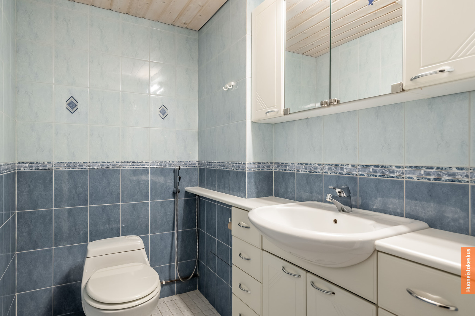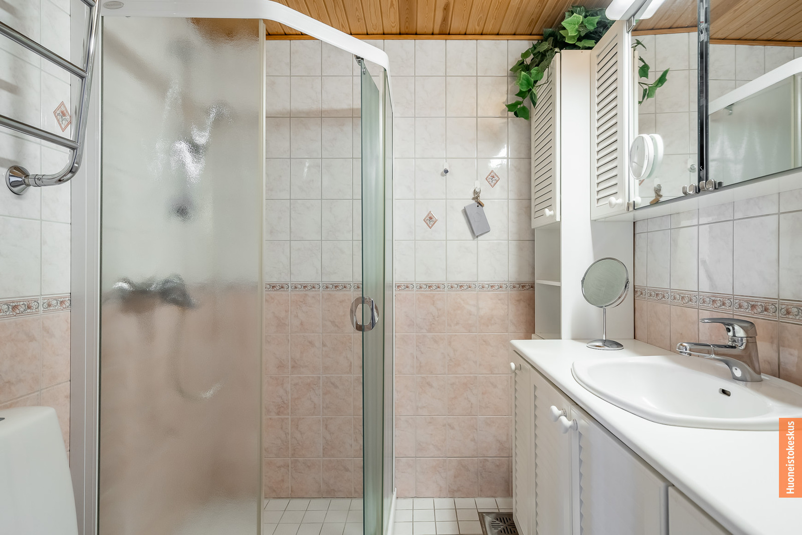 | Kylpyhuoneen kuvaus | Peilikaappi, suihkuseinä, allaskaappi, suihku, wc-istuin ja kiinteät valaisimet, seinät (kaakeli), lattiat (laatta) |