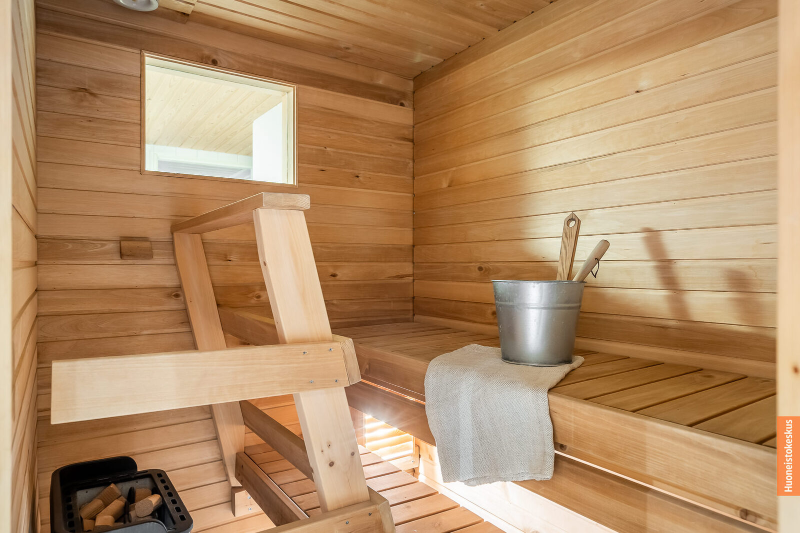 | Saunan kuvaus | Seinät (puu), lattiat (laatta), Sähkökiuas |