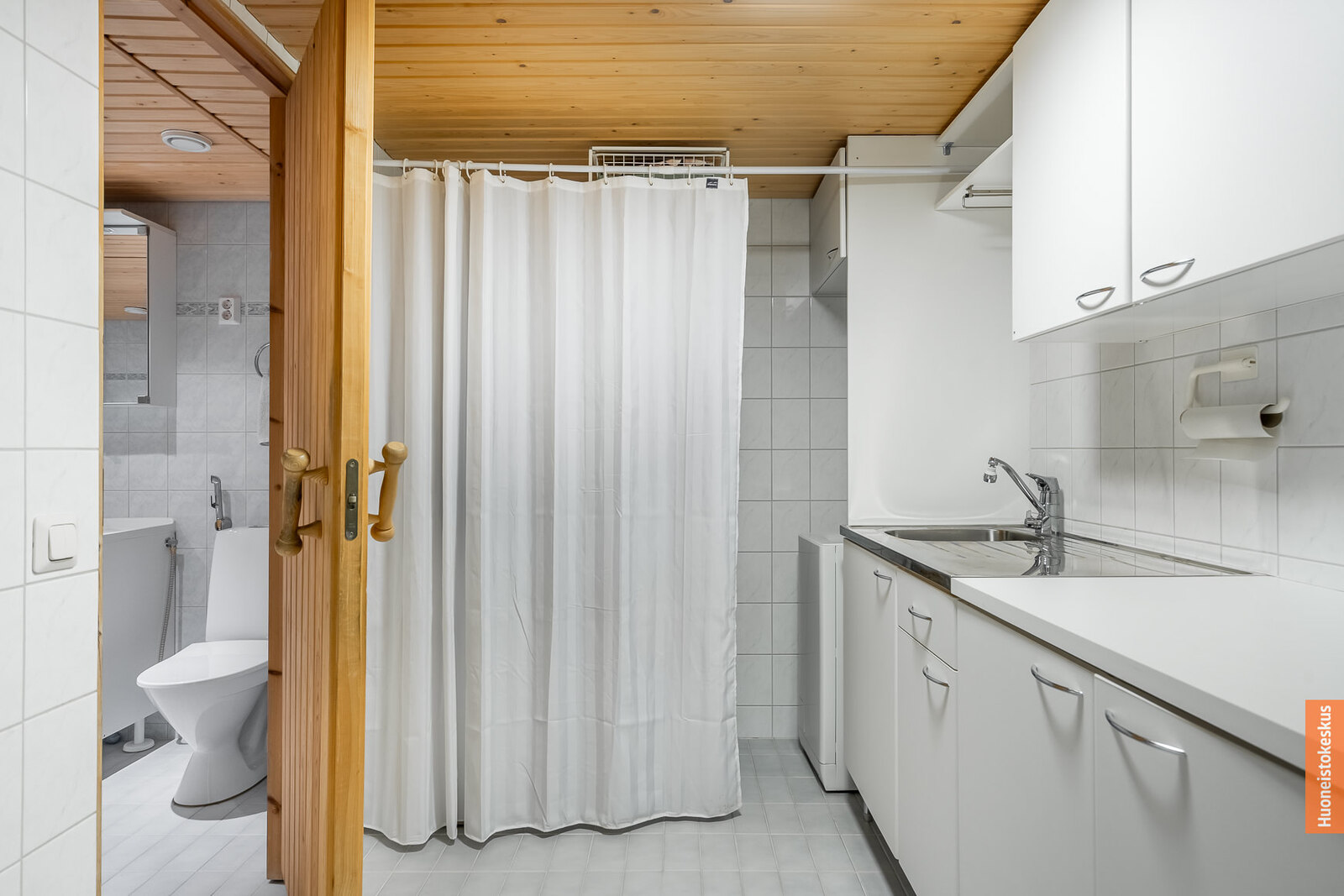| Kodinhoitohuoneen kuvaus | Pesukone, pesuallas, pesukoneliitäntä, pyykkikaapit, lattialämmitys ja silityspöytä/taso, lattiat (laatta), seinät (kaakeli) |