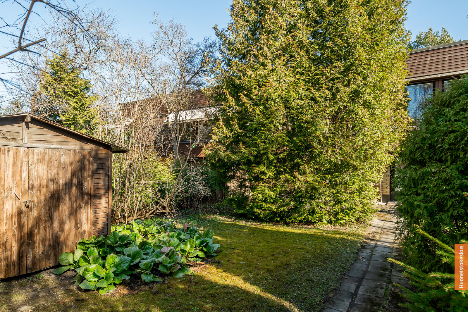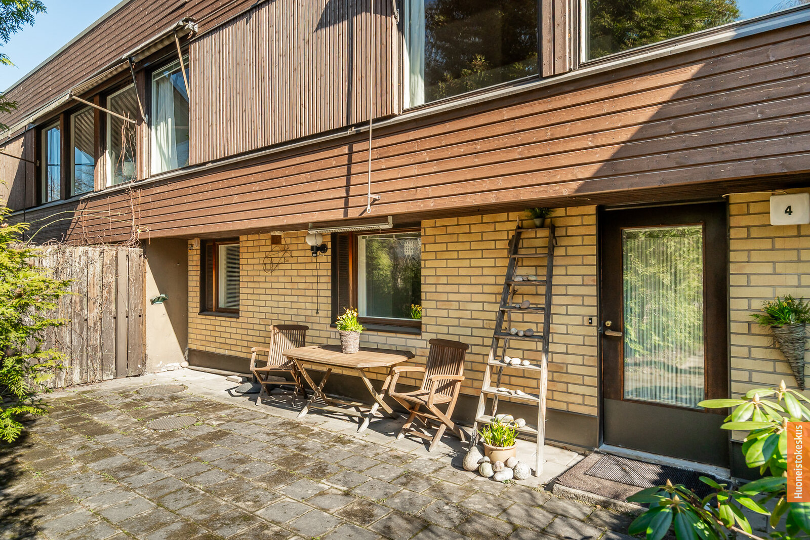 Alakerrasta pääsee omalle hyvän kokoiselle sekä suojaiselle pihalle, jossa voi nauttia ilta-auringosta. Auton saa autotalliin sekä takapihalle.