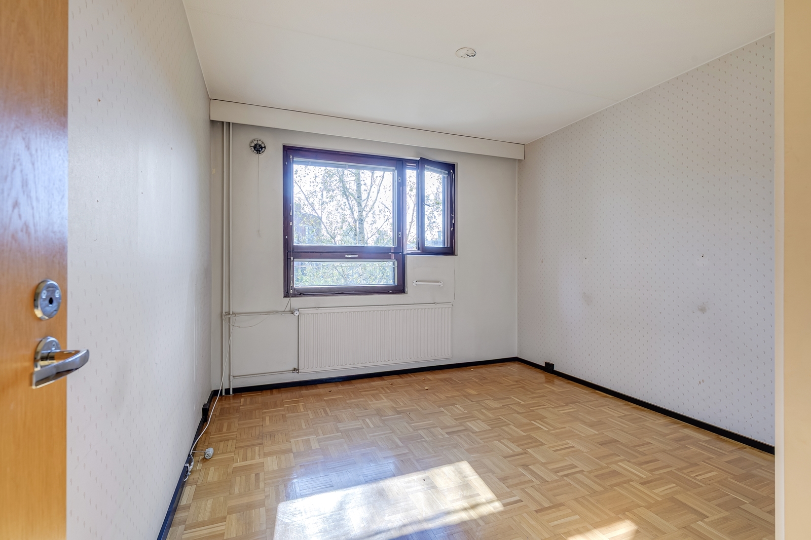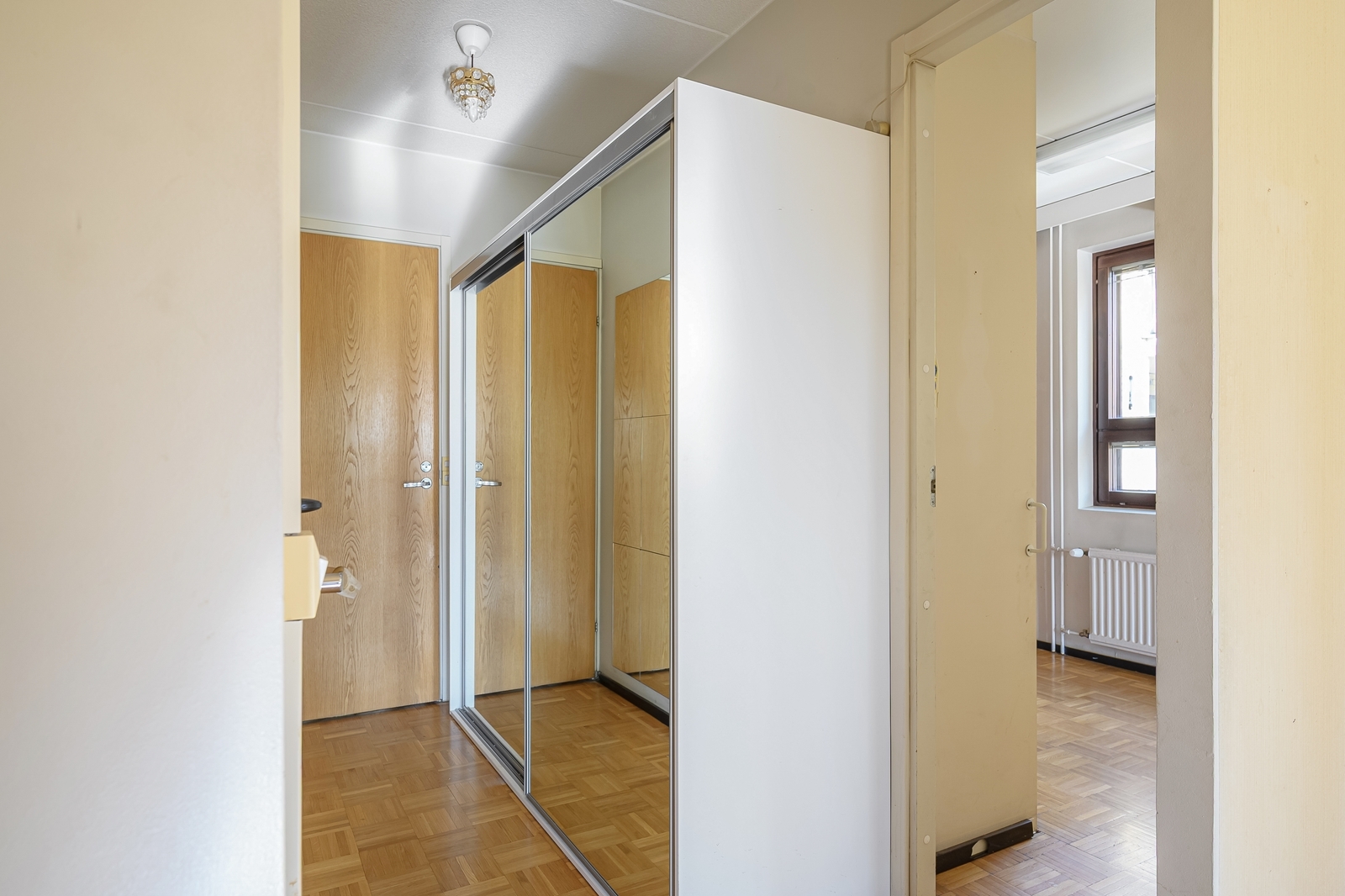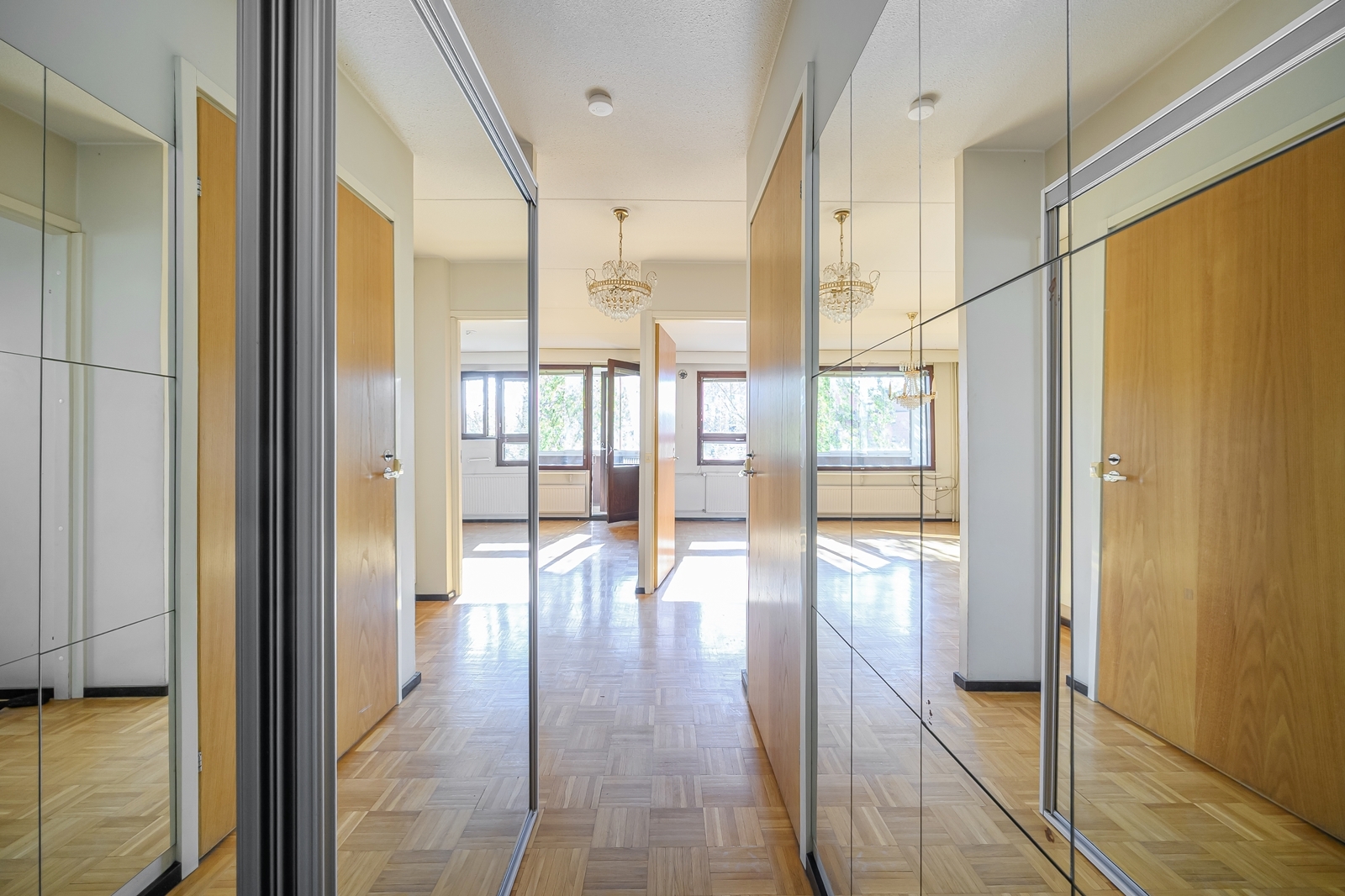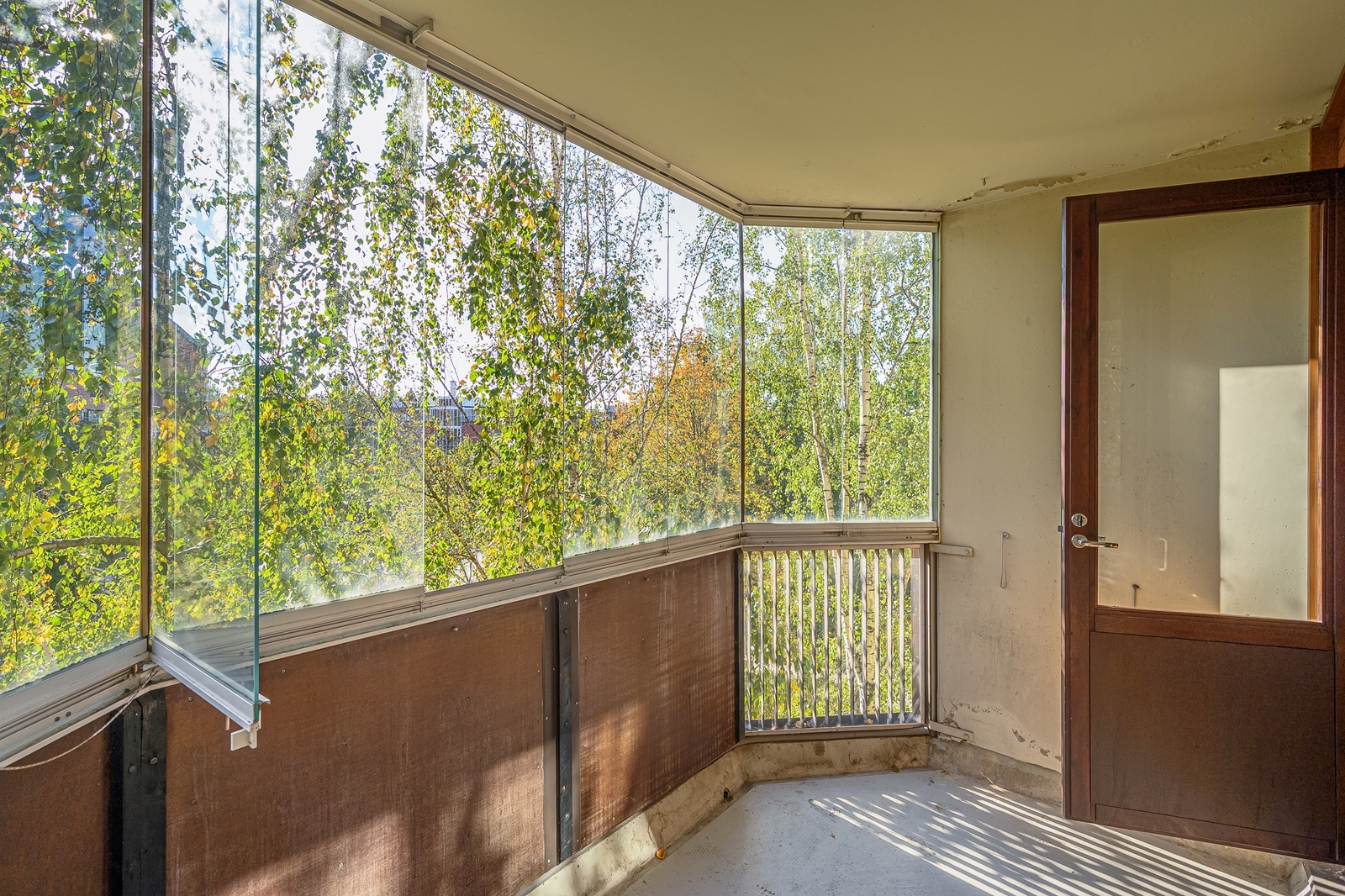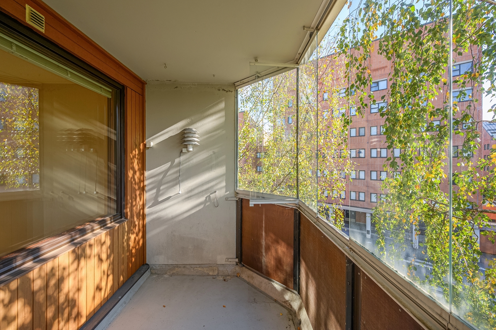 Olohuone on tilava ja sen jatkeena on lasitettu parveke sekä osittain tilaan avautuva tilava keittiö. Makuuhuone on hyvänkokoinen ja kaappitila löytyy sekä sieltä, että eteisestä. Ikkunallisessa kylpyhuoneessa on tilaa pesukoneelle ja sen yhteydessä on niin ikään oma, ikkunallinen sauna. Asunnon kylpyhuone on hyvässä kunnossa, mutta muutoin asunto on remontin tarpeessa.