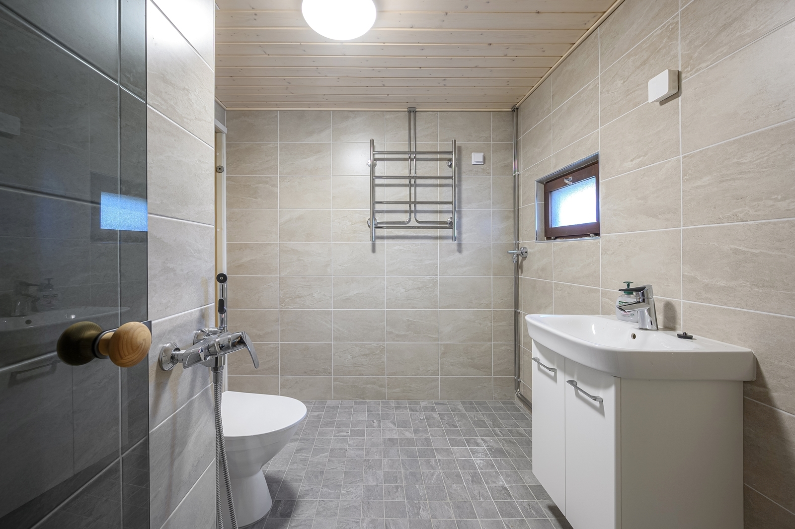 | Kylpyhuoneen kuvaus | WC-istuin, suihku, allaskaappi ja pesukoneliitäntä, seinät (kaakeli), lattiat (laatta) |