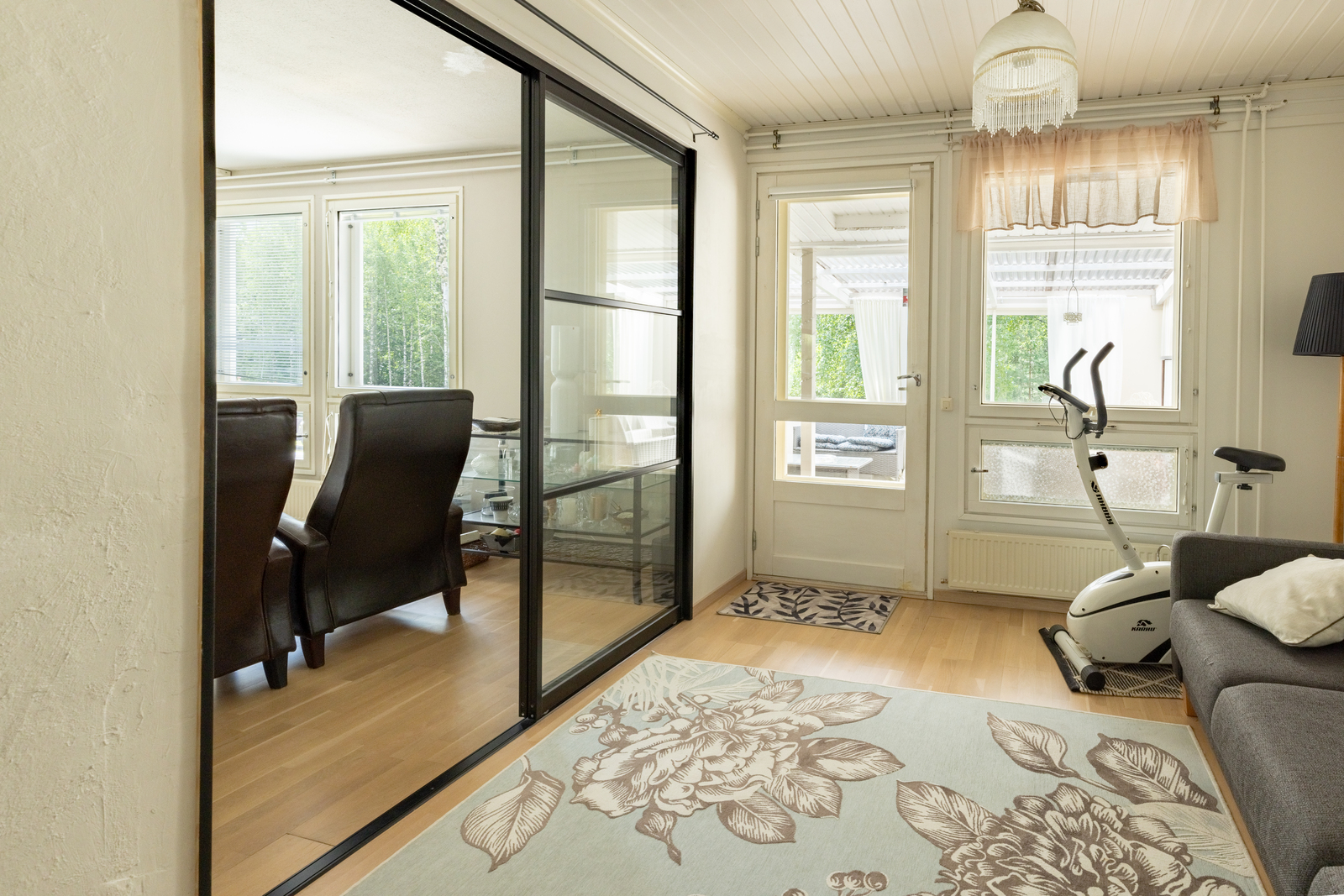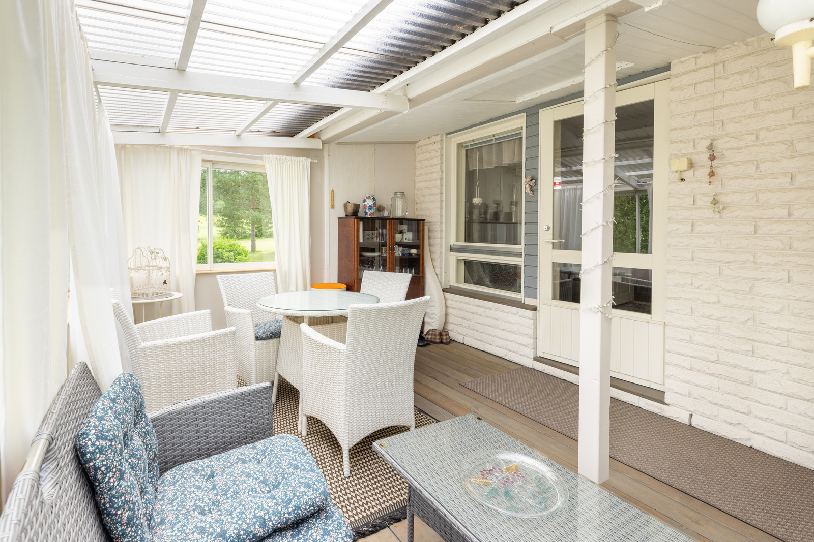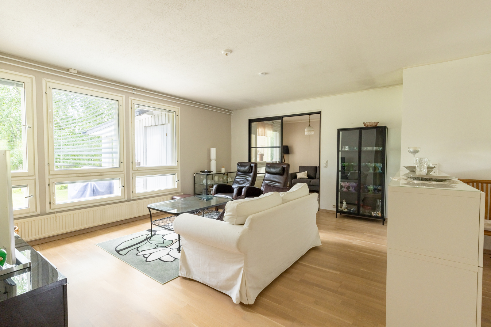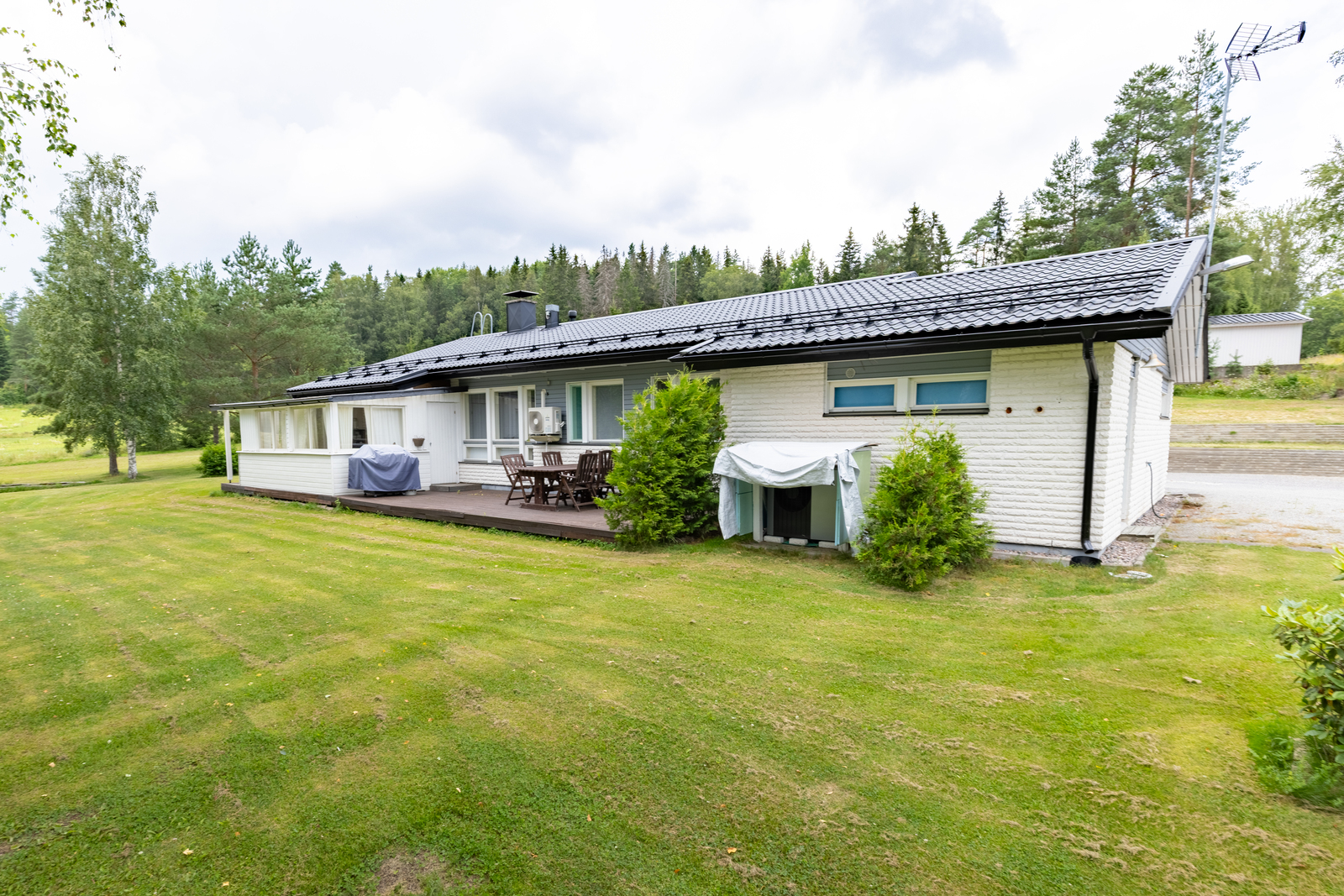 Tämä viihtyisä ja hyvin pidetty Jukkatalon omakotitalo (155 m² + 19 m²) tarjoaa toimivat tilat yhdessä tasossa. Talossa on olohuone, keittiö, takkahuone, saunaosasto, kodinhoitohuone, kolme makuuhuonetta, vaatehuone sekä autotalli ja varasto. Lasitettu terassi jatkaa oleskelua pitkälle syksyyn.