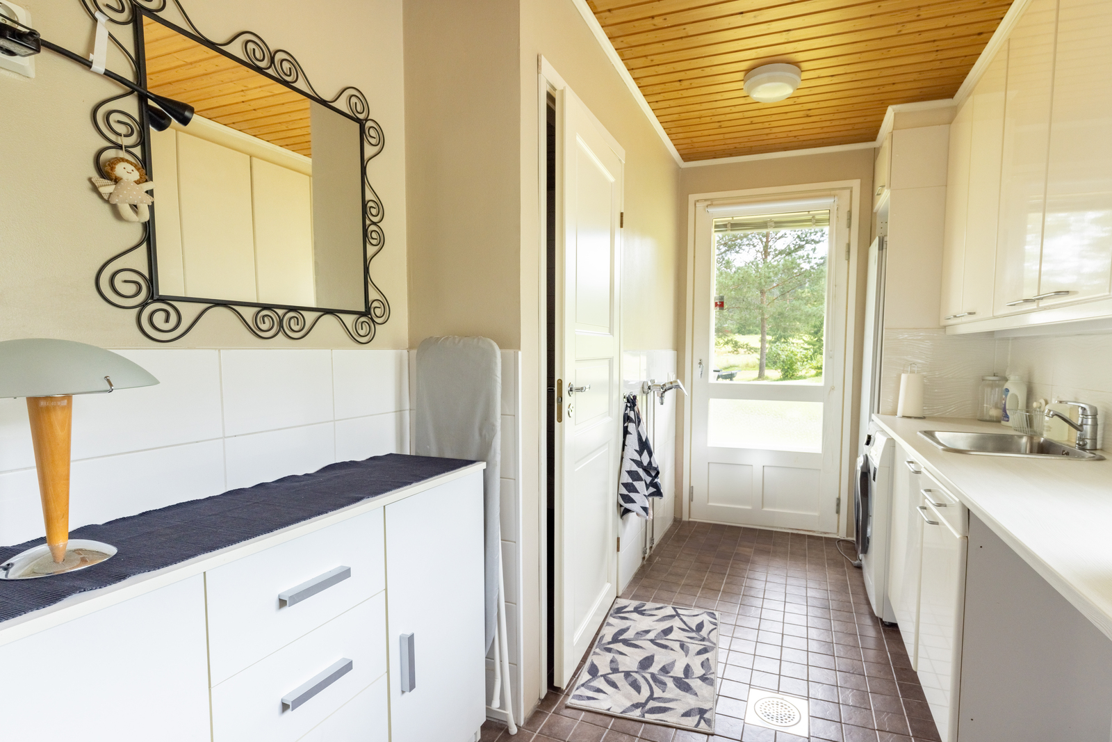 | Kodinhoitohuoneen kuvaus | Pesuallas, pesukoneliitäntä, keskuspölynimuri, lattiakaivo, pöytätaso ja lattialämmitys, lattiat (laatta), seinät (kaakeli) |