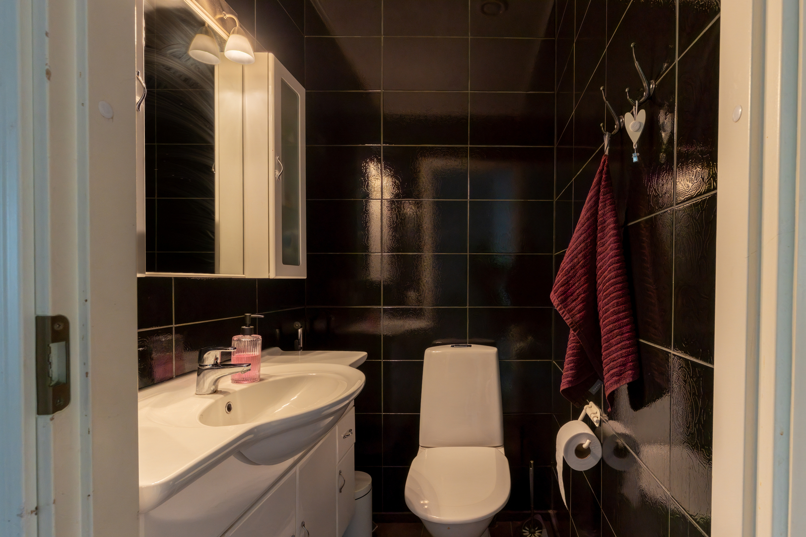 | Kylpyhuoneen kuvaus | Lattialämmitys, wc-istuin, suihku ja kiinteät valaisimet, seinät (kaakeli), lattiat (laatta) |