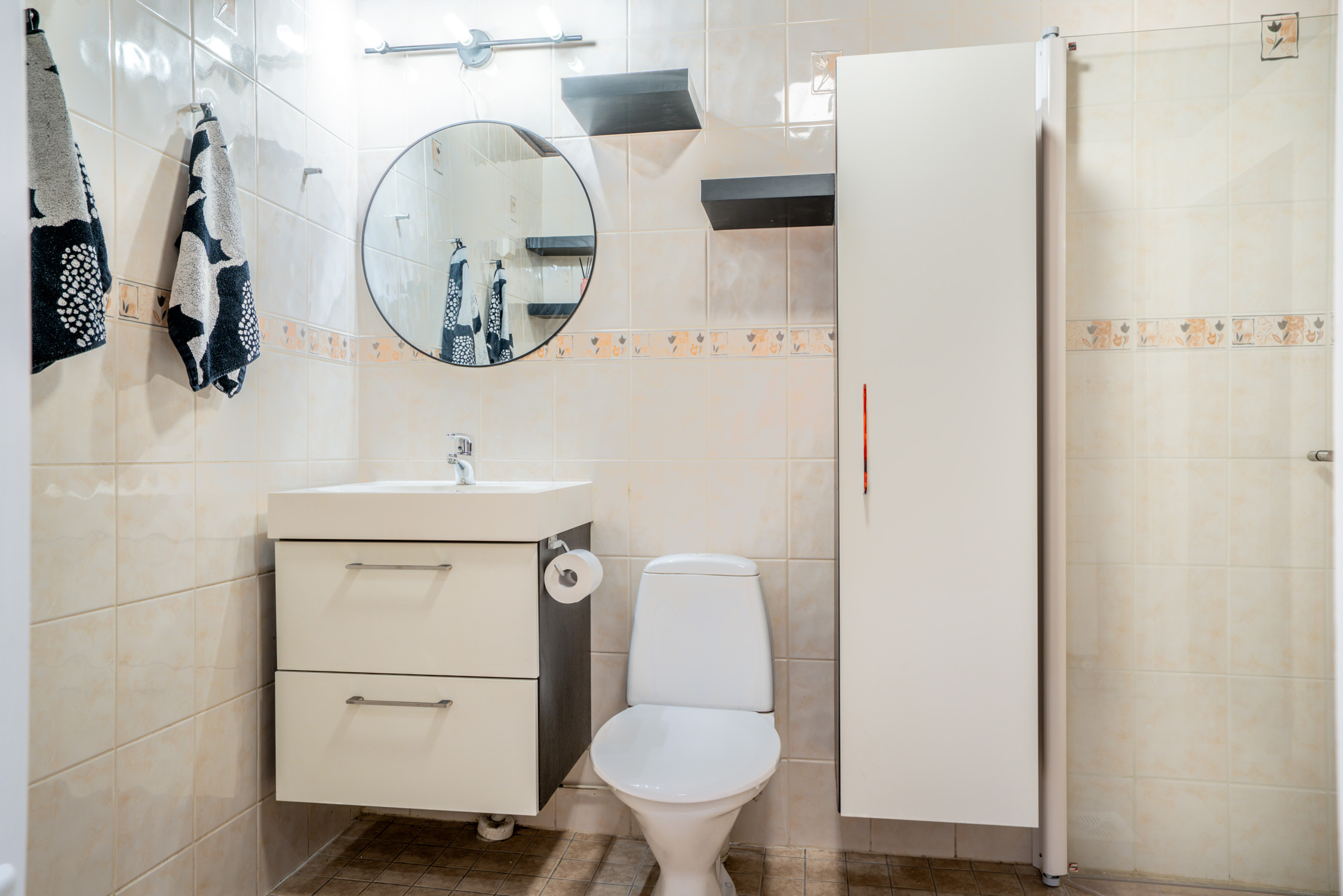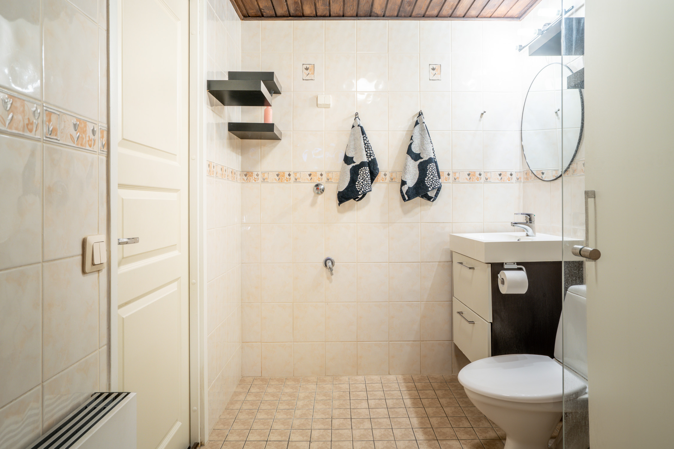 | Kylpyhuoneen kuvaus | WC-istuin, suihku, suihkuseinä, peili, pesukoneliitäntä ja allaskaappi, seinät (kaakeli), lattiat (laatta) |