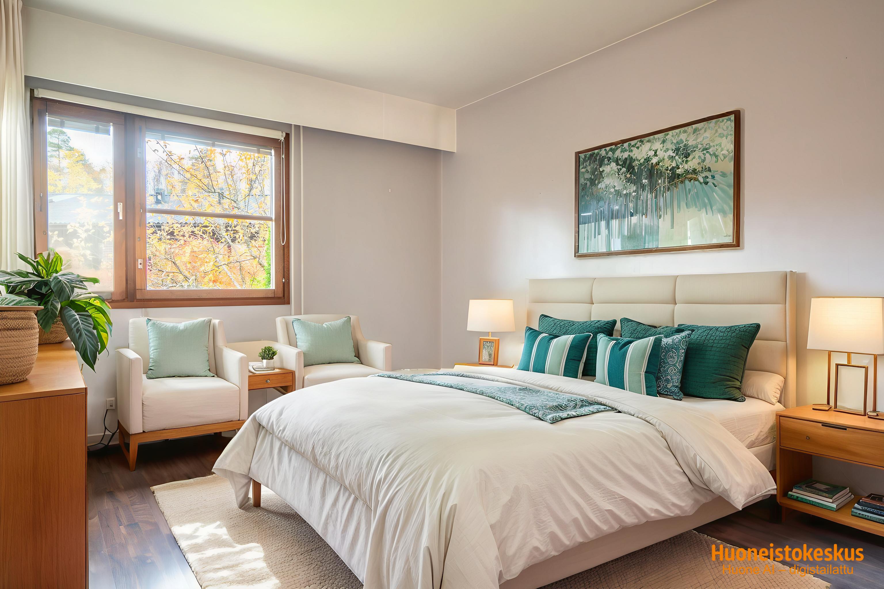 | Makuuhuoneen kuvaus | Lukumäärä: 1, seinät (tapetti ja maali), lattiat (laminaatti) |