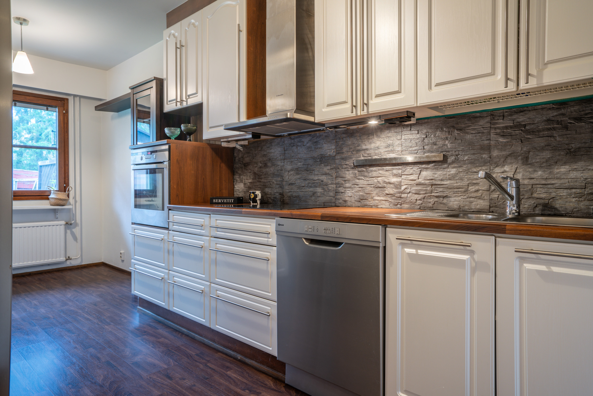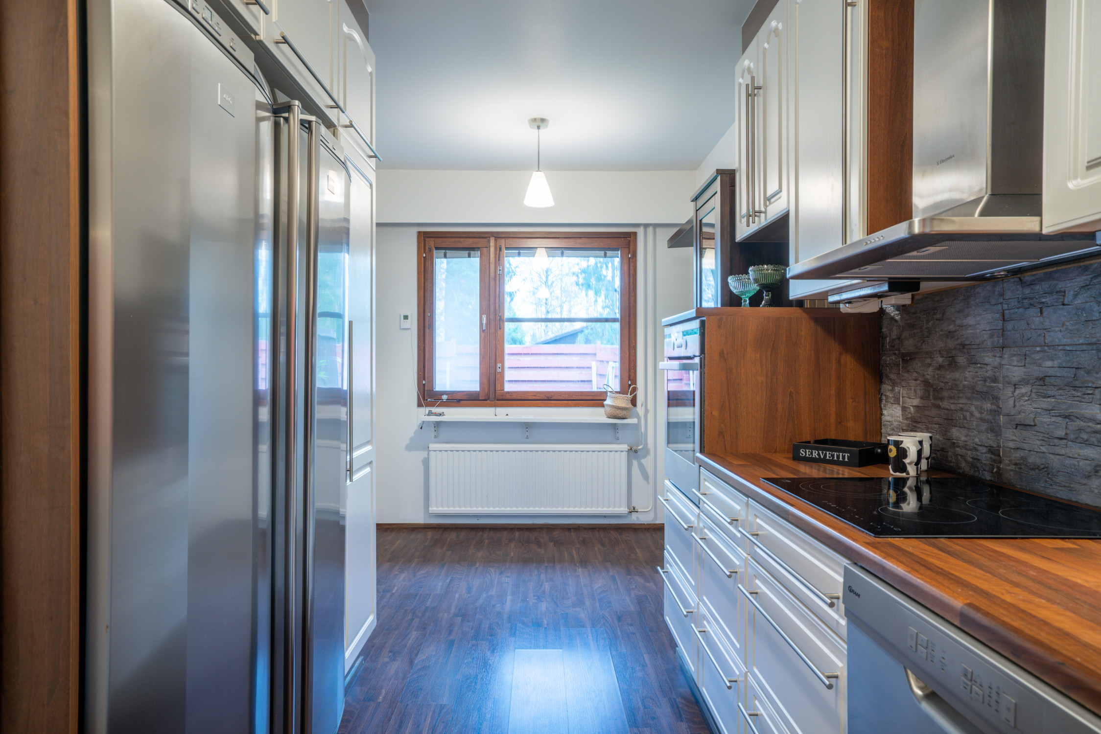 | Keittiön kuvaus | Liesi (Keraaminen liesi), työtasot (laminaatti), seinät (maali, tapetti ja kaakeli), lattiat (laminaatti), jääkaappi (Aeg), erillinen pakastin (Aeg), liesi (Aeg), liesituuletin (Electrolux), astianpesukone (Gram) ja uuni (Aeg) |