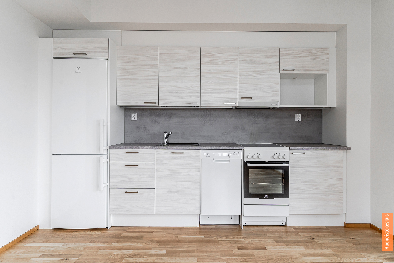 | Keittiön kuvaus | Liesi (sähköliesi), työtasot (laminaatti), seinät (maali), lattiat (parketti), liesituuletin, liesi, jääkaappipakastin, astianpesukone ja kiinteät valaisimet |