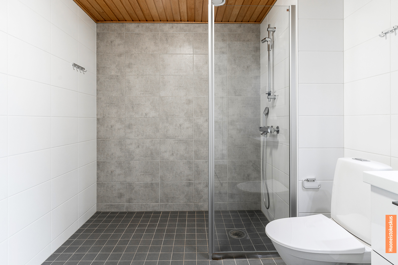 | Kylpyhuoneen kuvaus | Suihku, wc-istuin, lattialämmitys, peilikaappi, pesukoneliitäntä, suihkuseinä, allaskaappi ja kiinteät valaisimet, seinät (kaakeli), lattiat (laatta) |